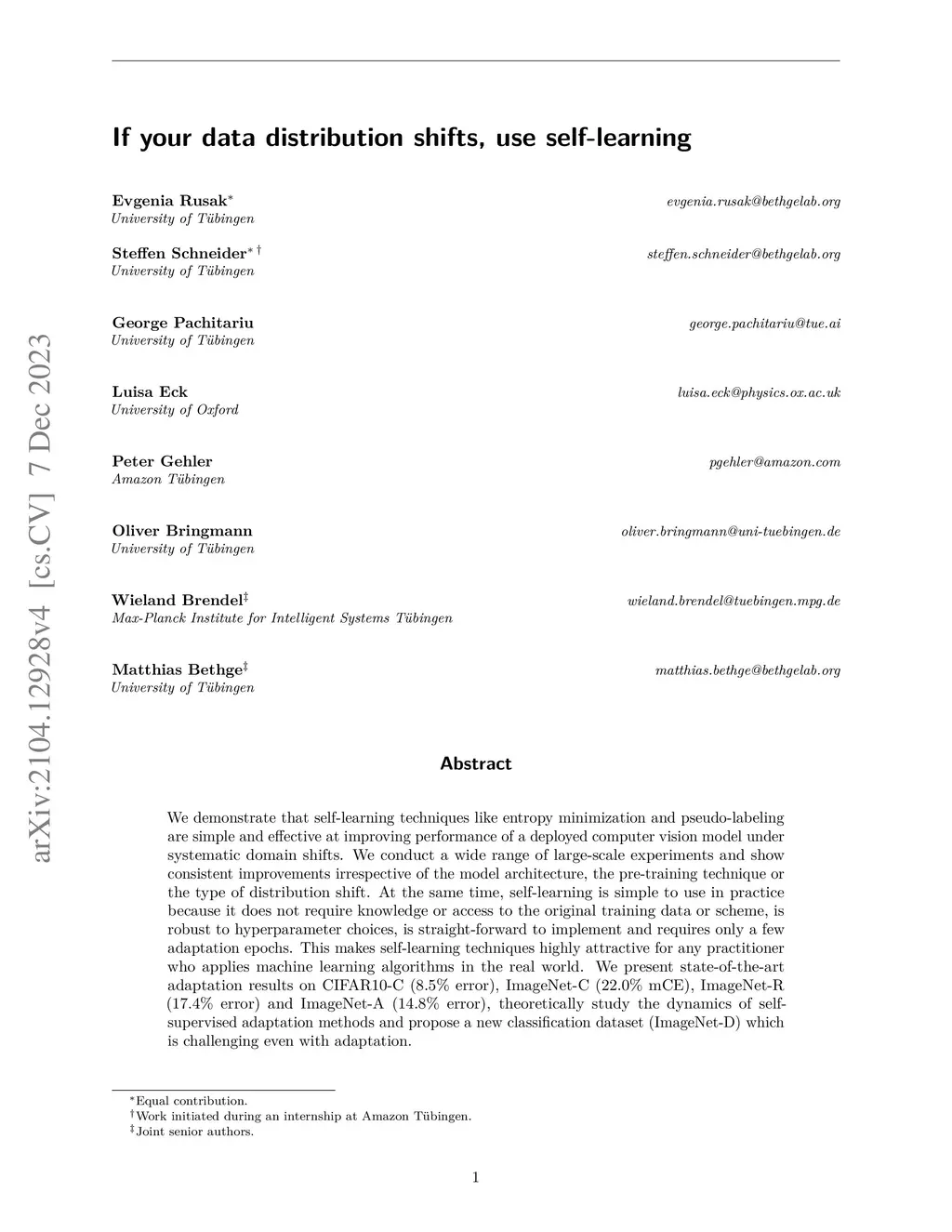 We demonstrate that self-learning techniques like entropy minimization and pseudo-labeling are simple and effective at improving performance of a deployed computer vision model under systematic domain shifts. We conduct a wide range of large-scale experiments and show consistent improvements irrespective of the model architecture, the pre-training technique or the type of distribution shift. At the same time, self-learning is simple to use in practice because it does not require knowledge or access to the original training data or scheme, is robust to hyperparameter choices, is straight-forward to implement and requires only a few adaptation epochs. This makes self-learning techniques highly attractive for any practitioner who applies machine learning algorithms in the real world. We present state-of-the-art adaptation results on CIFAR10-C (8.5% error), ImageNet-C (22.0% mCE), ImageNet-R (17.4% error) and ImageNet-A (14.8% error), theoretically study the dynamics of self-supervised adaptation methods and propose a new classification dataset (ImageNet-D) which is challenging even with adaptation.