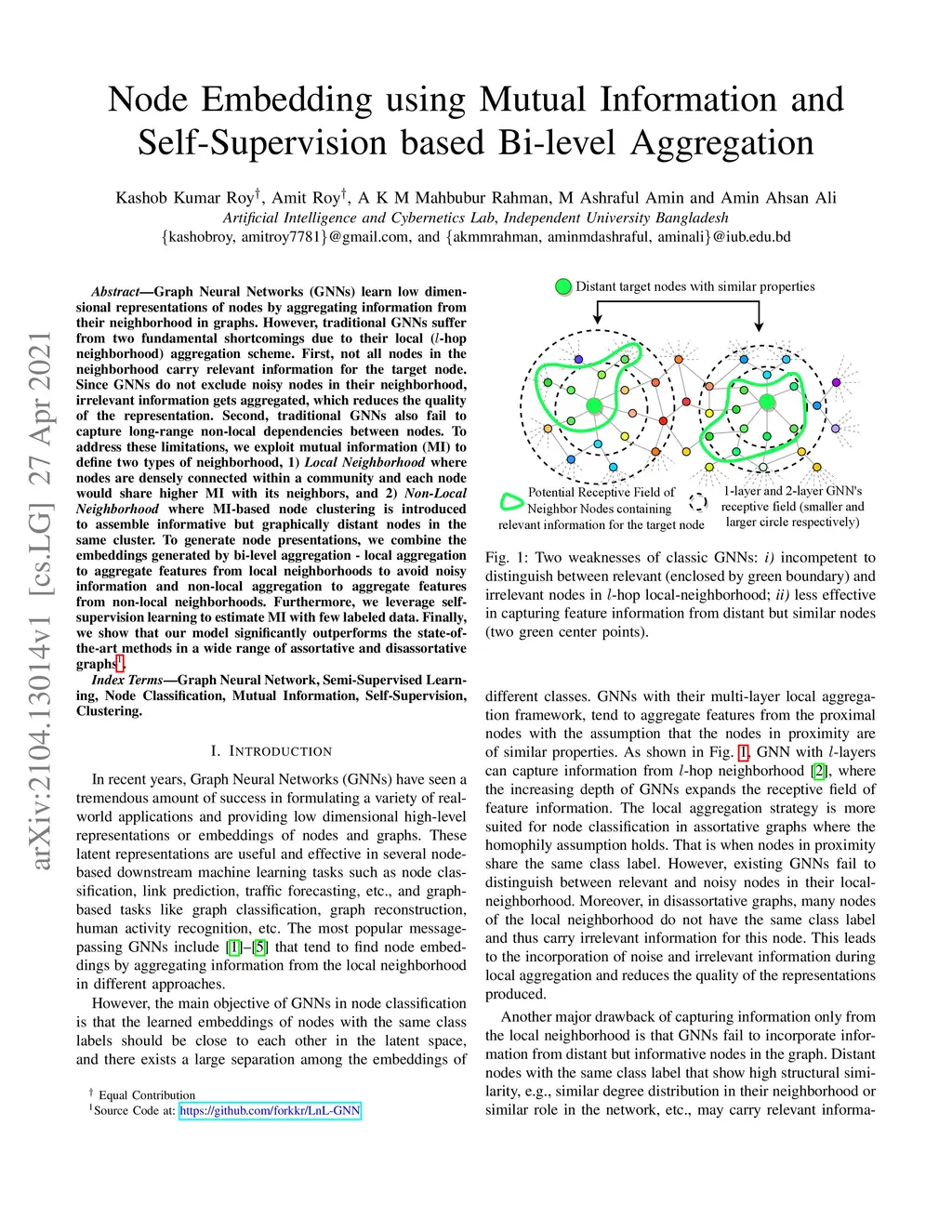Graph Neural Networks (GNNs) learn low dimensional representations of nodes by aggregating information from their neighborhood in graphs. However, traditional GNNs suffer from two fundamental shortcomings due to their local (-hop neighborhood) aggregation scheme. First, not all nodes in the neighborhood carry relevant information for the target node. Since GNNs do not exclude noisy nodes in their neighborhood, irrelevant information gets aggregated, which reduces the quality of the representation. Second, traditional GNNs also fail to capture long-range non-local dependencies between nodes. To address these limitations, we exploit mutual information (MI) to define two types of neighborhood, 1) \textit{Local Neighborhood} where nodes are densely connected within a community and each node would share higher MI with its neighbors, and 2) \textit{Non-Local Neighborhood} where MI-based node clustering is introduced to assemble informative but graphically distant nodes in the same cluster. To generate node presentations, we combine the embeddings generated by bi-level aggregation - local aggregation to aggregate features from local neighborhoods to avoid noisy information and non-local aggregation to aggregate features from non-local neighborhoods. Furthermore, we leverage self-supervision learning to estimate MI with few labeled data. Finally, we show that our model significantly outperforms the state-of-the-art methods in a wide range of assortative and disassortative graphs.