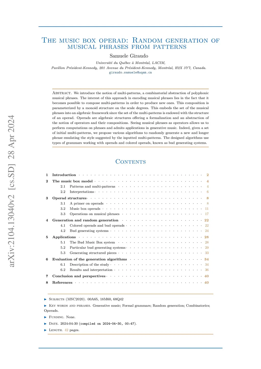 We introduce the notion of multi-patterns, a combinatorial abstraction of polyphonic musical phrases. The interest of this approach in encoding musical phrases lies in the fact that it becomes possible to compose multi-patterns in order to produce new ones. This composition is parameterized by a monoid structure on the scale degrees. This embeds the set of the musical phrases into an algebraic framework since the set of the multi-patterns is endowed with the structure of an operad. Operads are algebraic structures offering a formalization and an abstraction of the notion of operators and their compositions. Seeing musical phrases as operators allows us to perform computations on phrases and admits applications in generative music. Indeed, given a set of initial multi-patterns, we propose various algorithms to randomly generate a new and longer phrase emulating the style suggested by the inputted multi-patterns. The designed algorithms use types of grammars working with operads and colored operads, known as bud generating systems.