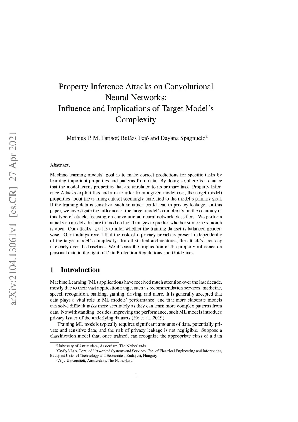 Machine learning models' goal is to make correct predictions for specific tasks by learning important properties and patterns from data. By doing so, there is a chance that the model learns properties that are unrelated to its primary task. Property Inference Attacks exploit this and aim to infer from a given model (\ie the target model) properties about the training dataset seemingly unrelated to the model's primary goal. If the training data is sensitive, such an attack could lead to privacy leakage. This paper investigates the influence of the target model's complexity on the accuracy of this type of attack, focusing on convolutional neural network classifiers. We perform attacks on models that are trained on facial images to predict whether someone's mouth is open. Our attacks' goal is to infer whether the training dataset is balanced gender-wise. Our findings reveal that the risk of a privacy breach is present independently of the target model's complexity: for all studied architectures, the attack's accuracy is clearly over the baseline. We discuss the implication of the property inference on personal data in the light of Data Protection Regulations and Guidelines.