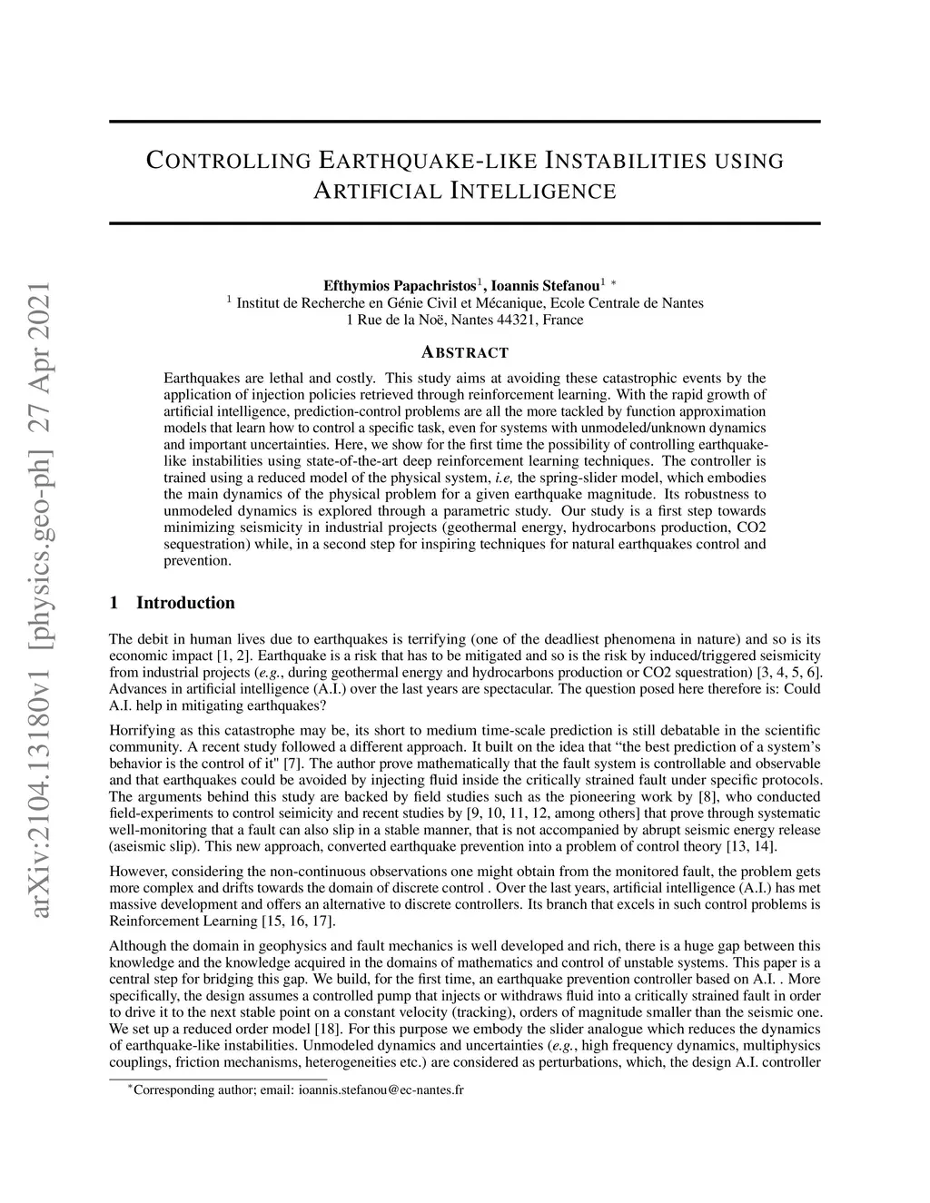 Earthquakes are lethal and costly. This study aims at avoiding these catastrophic events by the application of injection policies retrieved through reinforcement learning. With the rapid growth of artificial intelligence, prediction-control problems are all the more tackled by function approximation models that learn how to control a specific task, even for systems with unmodeled/unknown dynamics and important uncertainties. Here, we show for the first time the possibility of controlling earthquake-like instabilities using state-of-the-art deep reinforcement learning techniques. The controller is trained using a reduced model of the physical system, i.e, the spring-slider model, which embodies the main dynamics of the physical problem for a given earthquake magnitude. Its robustness to unmodeled dynamics is explored through a parametric study. Our study is a first step towards minimizing seismicity in industrial projects (geothermal energy, hydrocarbons production, CO2 sequestration) while, in a second step for inspiring techniques for natural earthquakes control and prevention.