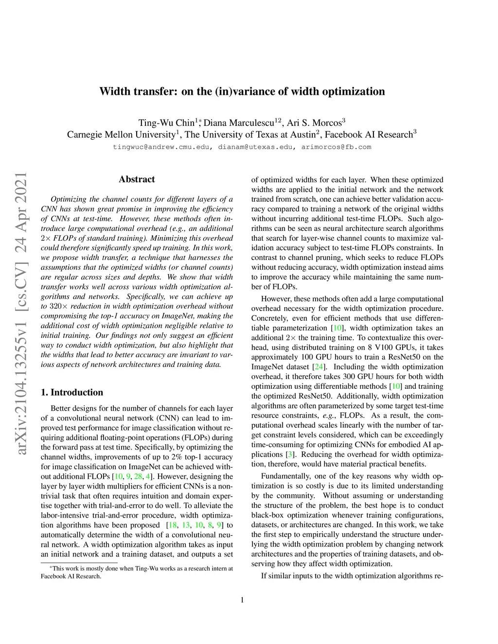 Optimizing the channel counts for different layers of a CNN has shown great promise in improving the efficiency of CNNs at test-time. However, these methods often introduce large computational overhead (e.g., an additional 2x FLOPs of standard training). Minimizing this overhead could therefore significantly speed up training. In this work, we propose width transfer, a technique that harnesses the assumptions that the optimized widths (or channel counts) are regular across sizes and depths. We show that width transfer works well across various width optimization algorithms and networks. Specifically, we can achieve up to 320x reduction in width optimization overhead without compromising the top-1 accuracy on ImageNet, making the additional cost of width optimization negligible relative to initial training. Our findings not only suggest an efficient way to conduct width optimization but also highlight that the widths that lead to better accuracy are invariant to various aspects of network architectures and training data.