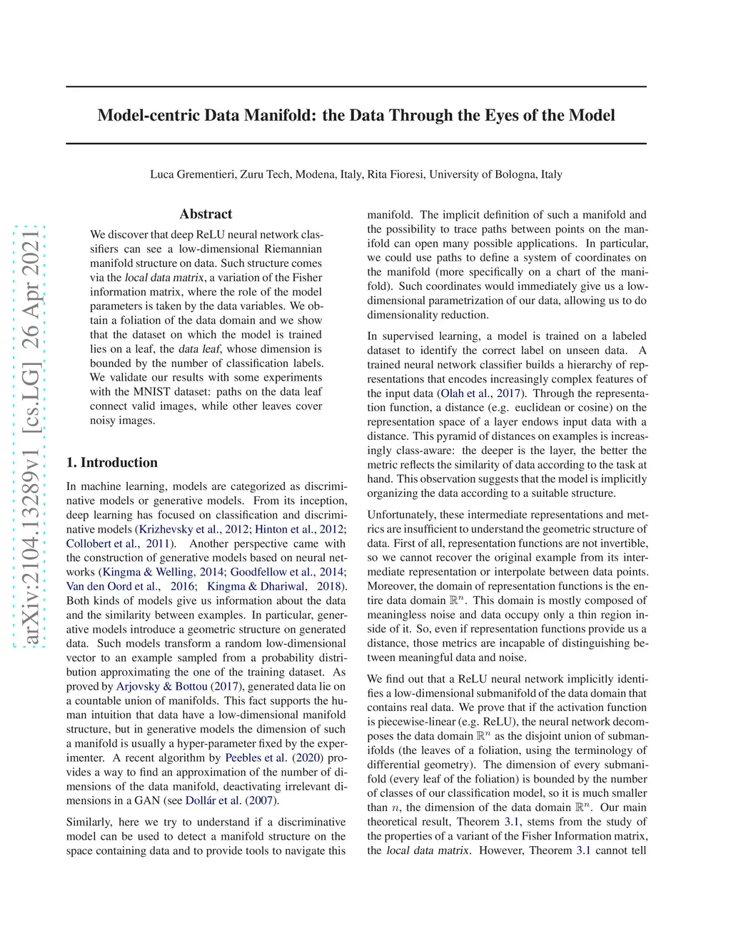 We discover that deep ReLU neural network classifiers can see a low-dimensional Riemannian manifold structure on data. Such structure comes via the local data matrix, a variation of the Fisher information matrix, where the role of the model parameters is taken by the data variables. We obtain a foliation of the data domain and we show that the dataset on which the model is trained lies on a leaf, the data leaf, whose dimension is bounded by the number of classification labels. We validate our results with some experiments with the MNIST dataset: paths on the data leaf connect valid images, while other leaves cover noisy images.