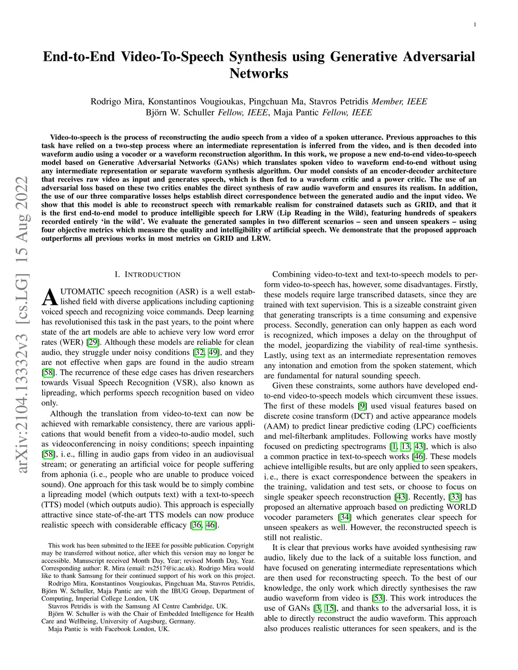 Video-to-speech is the process of reconstructing the audio speech from a video of a spoken utterance. Previous approaches to this task have relied on a two-step process where an intermediate representation is inferred from the video, and is then decoded into waveform audio using a vocoder or a waveform reconstruction algorithm. In this work, we propose a new end-to-end video-to-speech model based on Generative Adversarial Networks (GANs) which translates spoken video to waveform end-to-end without using any intermediate representation or separate waveform synthesis algorithm. Our model consists of an encoder-decoder architecture that receives raw video as input and generates speech, which is then fed to a waveform critic and a power critic. The use of an adversarial loss based on these two critics enables the direct synthesis of raw audio waveform and ensures its realism. In addition, the use of our three comparative losses helps establish direct correspondence between the generated audio and the input video. We show that this model is able to reconstruct speech with remarkable realism for constrained datasets such as GRID, and that it is the first end-to-end model to produce intelligible speech for LRW (Lip Reading in the Wild), featuring hundreds of speakers recorded entirely `in the wild'. We evaluate the generated samples in two different scenarios -- seen and unseen speakers -- using four objective metrics which measure the quality and intelligibility of artificial speech. We demonstrate that the proposed approach outperforms all previous works in most metrics on GRID and LRW.