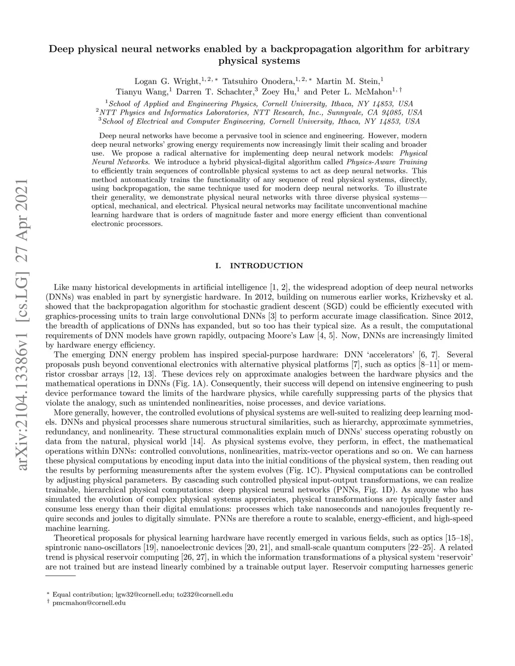 Deep neural networks have become a pervasive tool in science and engineering. However, modern deep neural networks' growing energy requirements now increasingly limit their scaling and broader use. We propose a radical alternative for implementing deep neural network models: Physical Neural Networks. We introduce a hybrid physical-digital algorithm called Physics-Aware Training to efficiently train sequences of controllable physical systems to act as deep neural networks. This method automatically trains the functionality of any sequence of real physical systems, directly, using backpropagation, the same technique used for modern deep neural networks. To illustrate their generality, we demonstrate physical neural networks with three diverse physical systems-optical, mechanical, and electrical. Physical neural networks may facilitate unconventional machine learning hardware that is orders of magnitude faster and more energy efficient than conventional electronic processors.