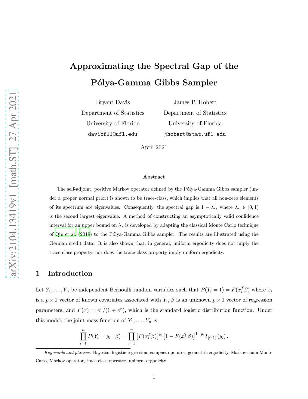 The self-adjoint, positive Markov operator defined by the P\ólya-Gamma Gibbs sampler (under a proper normal prior) is shown to be trace-class, which implies that all non-zero elements of its spectrum are eigenvalues. Consequently, the spectral gap is , where is the second largest eigenvalue. A method of constructing an asymptotically valid confidence interval for an upper bound on is developed by adapting the classical Monte Carlo technique of Qin et al. (2019) to the P\ólya-Gamma Gibbs sampler. The results are illustrated using the German credit data. It is also shown that, in general, uniform ergodicity does not imply the trace-class property, nor does the trace-class property imply uniform ergodicity.