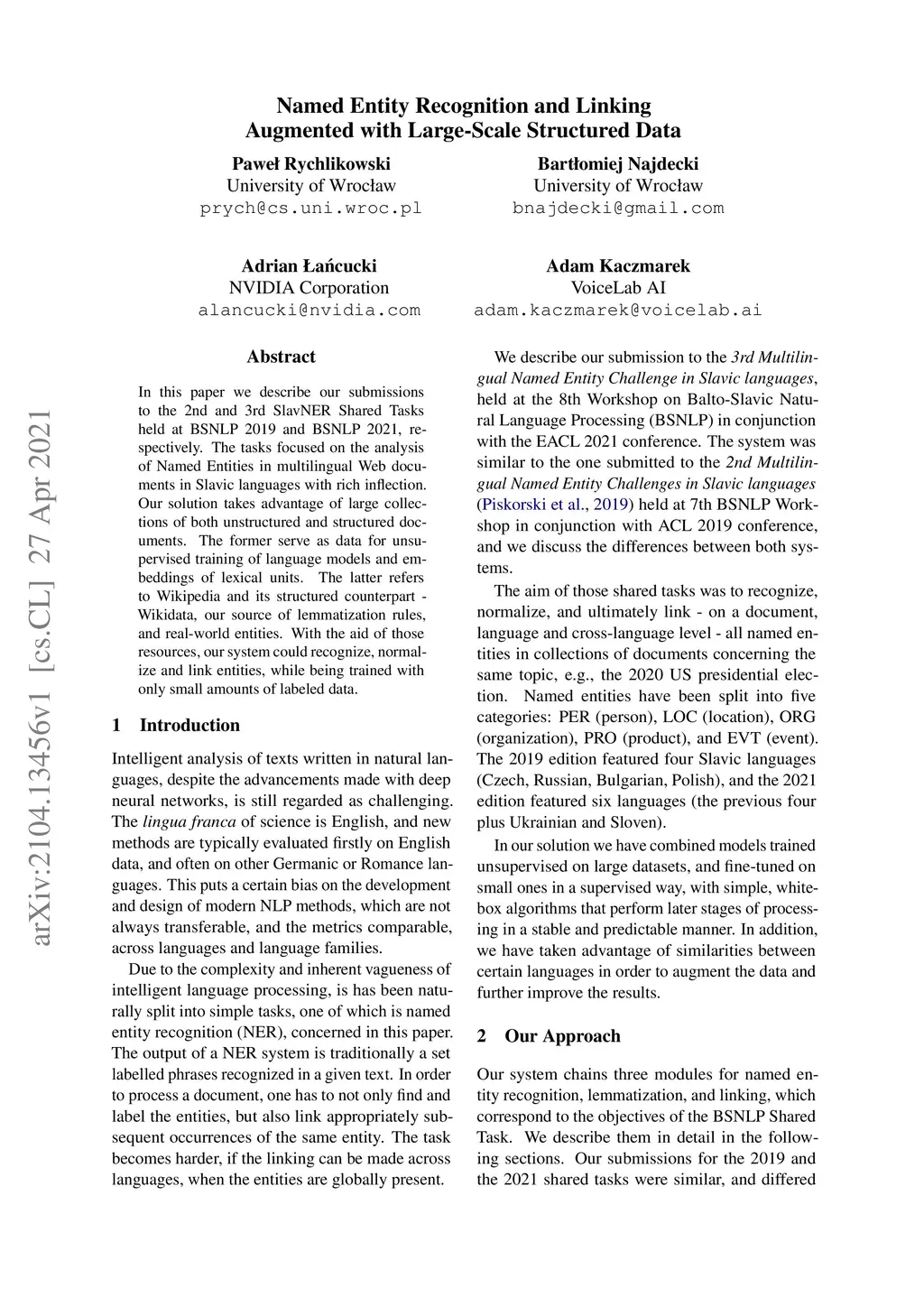 In this paper we describe our submissions to the 2nd and 3rd SlavNER Shared Tasks held at BSNLP 2019 and BSNLP 2021, respectively. The tasks focused on the analysis of Named Entities in multilingual Web documents in Slavic languages with rich inflection. Our solution takes advantage of large collections of both unstructured and structured documents. The former serve as data for unsupervised training of language models and embeddings of lexical units. The latter refers to Wikipedia and its structured counterpart - Wikidata, our source of lemmatization rules, and real-world entities. With the aid of those resources, our system could recognize, normalize and link entities, while being trained with only small amounts of labeled data.