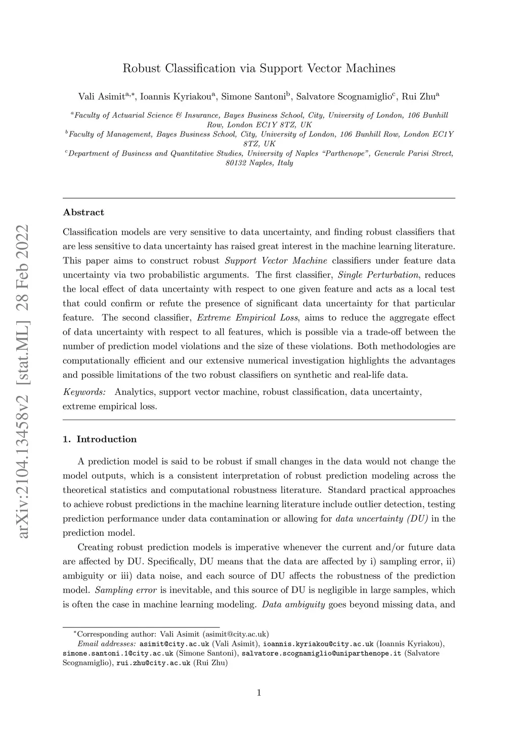 Classification models are very sensitive to data uncertainty, and finding robust classifiers that are less sensitive to data uncertainty has raised great interest in the machine learning literature. This paper aims to construct robust \emph{Support Vector Machine} classifiers under feature data uncertainty via two probabilistic arguments. The first classifier, \emph{Single Perturbation}, reduces the local effect of data uncertainty with respect to one given feature and acts as a local test that could confirm or refute the presence of significant data uncertainty for that particular feature. The second classifier, \emph{Extreme Empirical Loss}, aims to reduce the aggregate effect of data uncertainty with respect to all features, which is possible via a trade-off between the number of prediction model violations and the size of these violations. Both methodologies are computationally efficient and our extensive numerical investigation highlights the advantages and possible limitations of the two robust classifiers on synthetic and real-life data.