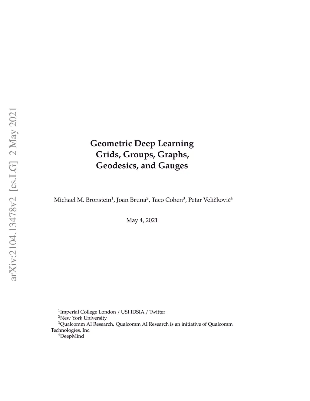 Geometric Deep Learning: Grids, Groups, Graphs, Geodesics, and Gauges