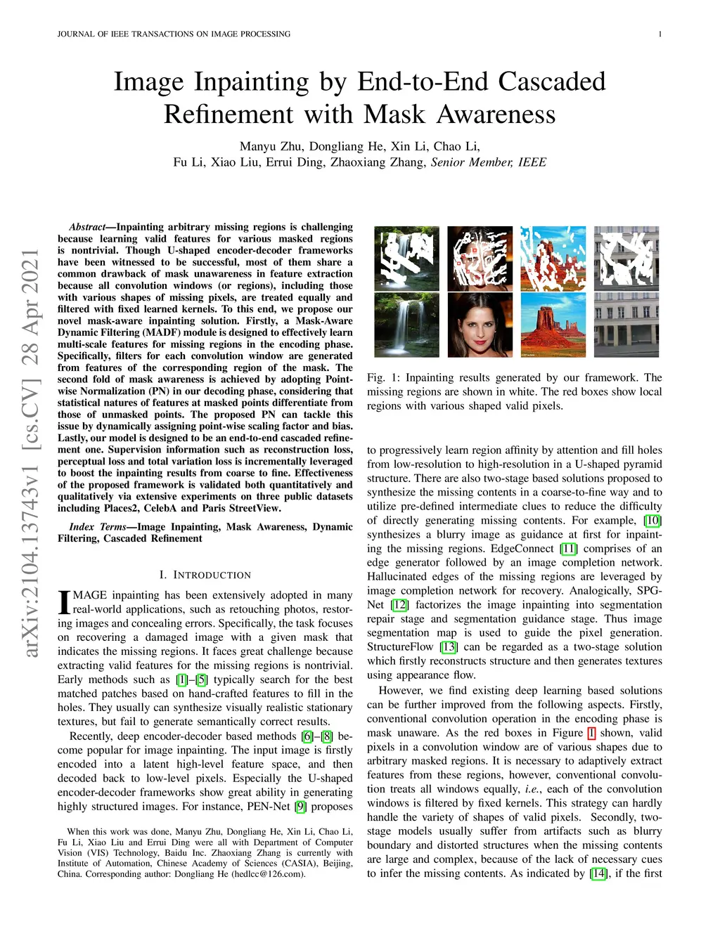 Image Inpainting by End-to-End Cascaded Refinement with Mask Awareness