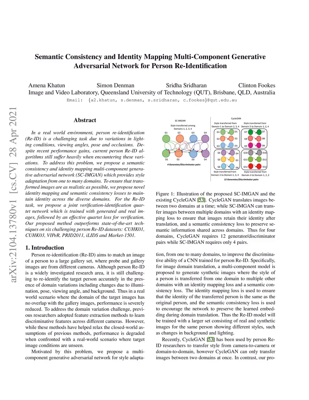 In a real world environment, person re-identification (Re-ID) is a challenging task due to variations in lighting conditions, viewing angles, pose and occlusions. Despite recent performance gains, current person Re-ID algorithms still suffer heavily when encountering these variations. To address this problem, we propose a semantic consistency and identity mapping multi-component generative adversarial network (SC-IMGAN) which provides style adaptation from one to many domains. To ensure that transformed images are as realistic as possible, we propose novel identity mapping and semantic consistency losses to maintain identity across the diverse domains. For the Re-ID task, we propose a joint verification-identification quartet network which is trained with generated and real images, followed by an effective quartet loss for verification. Our proposed method outperforms state-of-the-art techniques on six challenging person Re-ID datasets: CUHK01, CUHK03, VIPeR, PRID2011, iLIDS and Market-1501.