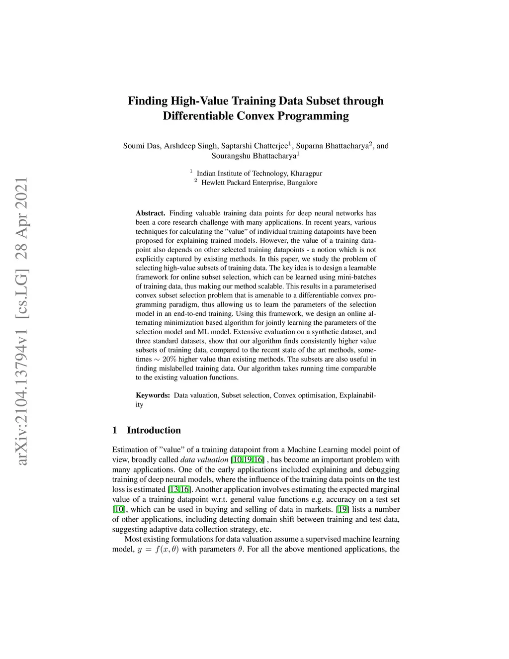 Finding valuable training data points for deep neural networks has been a core research challenge with many applications. In recent years, various techniques for calculating the "value" of individual training datapoints have been proposed for explaining trained models. However, the value of a training datapoint also depends on other selected training datapoints - a notion that is not explicitly captured by existing methods. In this paper, we study the problem of selecting high-value subsets of training data. The key idea is to design a learnable framework for online subset selection, which can be learned using mini-batches of training data, thus making our method scalable. This results in a parameterized convex subset selection problem that is amenable to a differentiable convex programming paradigm, thus allowing us to learn the parameters of the selection model in end-to-end training. Using this framework, we design an online alternating minimization-based algorithm for jointly learning the parameters of the selection model and ML model. Extensive evaluation on a synthetic dataset, and three standard datasets, show that our algorithm finds consistently higher value subsets of training data, compared to the recent state-of-the-art methods, sometimes ~20% higher value than existing methods. The subsets are also useful in finding mislabelled training data. Our algorithm takes running time comparable to the existing valuation functions.
