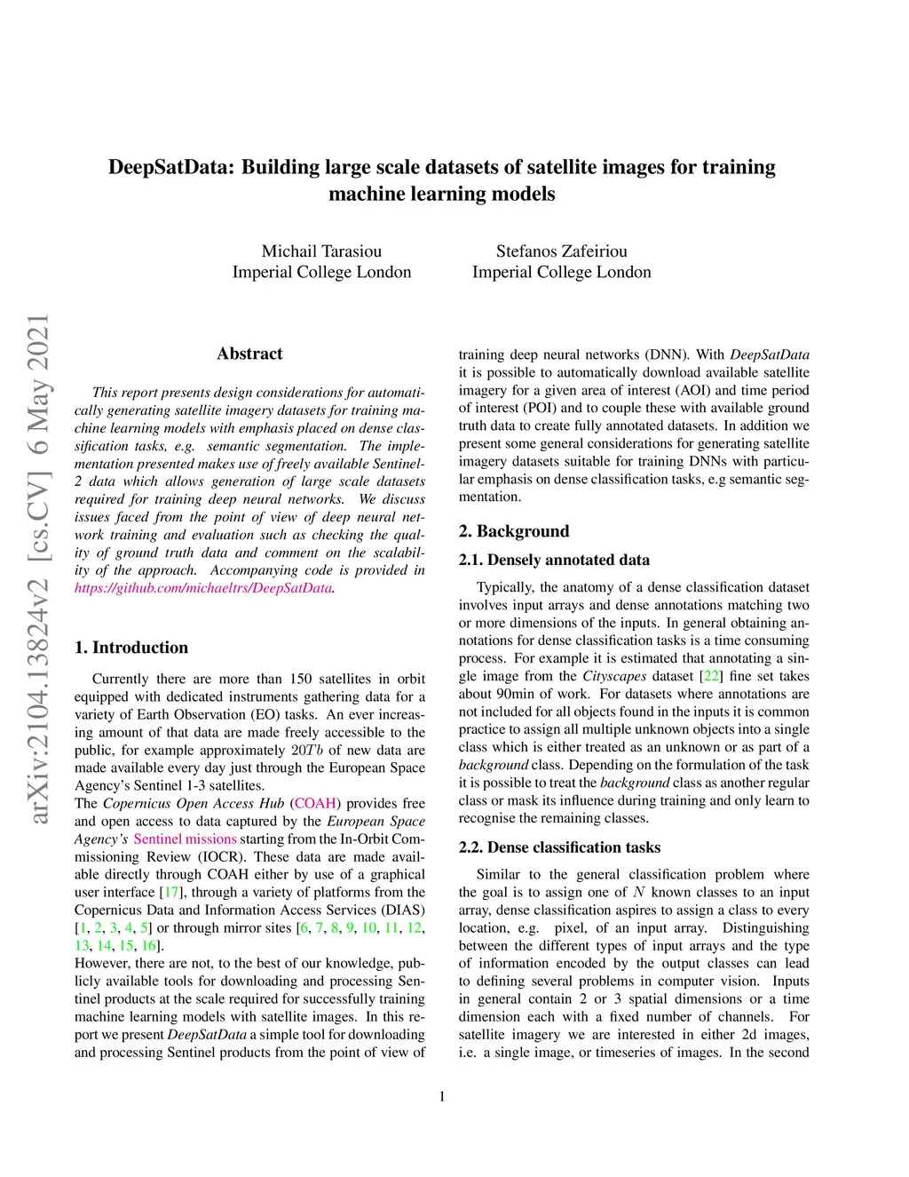 This report presents design considerations for automatically generating satellite imagery datasets for training machine learning models with emphasis placed on dense classification tasks, e.g. semantic segmentation. The implementation presented makes use of freely available Sentinel-2 data which allows generation of large scale datasets required for training deep neural networks. We discuss issues faced from the point of view of deep neural network training and evaluation such as checking the quality of ground truth data and comment on the scalability of the approach. Accompanying code is provided in https://github.com/michaeltrs/DeepSatData.