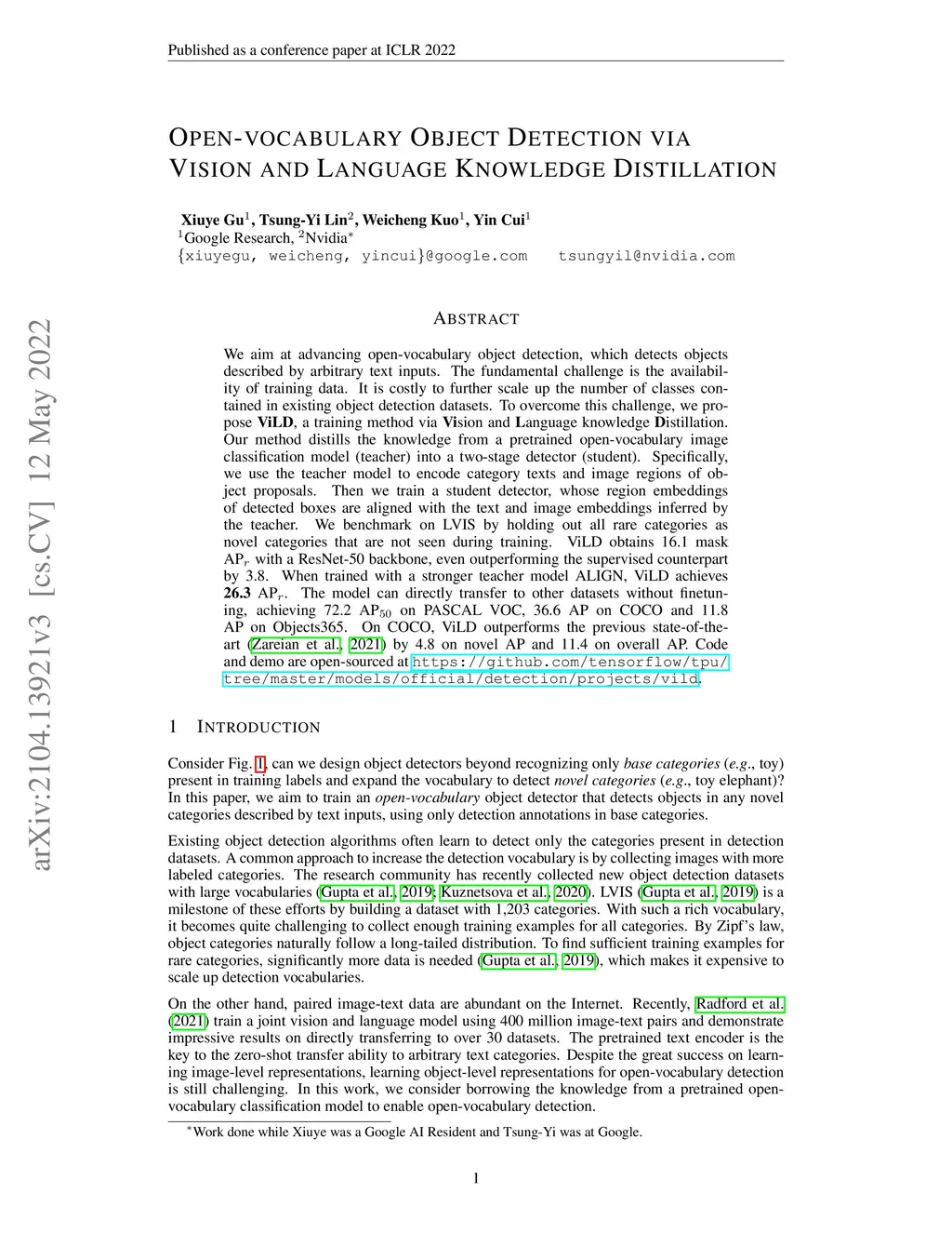We aim at advancing open-vocabulary object detection, which detects objects described by arbitrary text inputs. The fundamental challenge is the availability of training data. It is costly to further scale up the number of classes contained in existing object detection datasets. To overcome this challenge, we propose ViLD, a training method via Vision and Language knowledge Distillation. Our method distills the knowledge from a pretrained open-vocabulary image classification model (teacher) into a two-stage detector (student). Specifically, we use the teacher model to encode category texts and image regions of object proposals. Then we train a student detector, whose region embeddings of detected boxes are aligned with the text and image embeddings inferred by the teacher. We benchmark on LVIS by holding out all rare categories as novel categories that are not seen during training. ViLD obtains 16.1 mask AP with a ResNet-50 backbone, even outperforming the supervised counterpart by 3.8. When trained with a stronger teacher model ALIGN, ViLD achieves 26.3 AP. The model can directly transfer to other datasets without finetuning, achieving 72.2 AP on PASCAL VOC, 36.6 AP on COCO and 11.8 AP on Objects365. On COCO, ViLD outperforms the previous state-of-the-art by 4.8 on novel AP and 11.4 on overall AP. Code and demo are open-sourced at https://github.com/tensorflow/tpu/tree/master/models/official/detection/projects/vild.