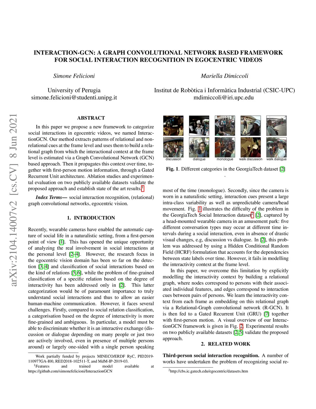 In this paper we propose a new framework to categorize social interactions in egocentric videos, we named InteractionGCN. Our method extracts patterns of relational and non-relational cues at the frame level and uses them to build a relational graph from which the interactional context at the frame level is estimated via a Graph Convolutional Network based approach. Then it propagates this context over time, together with first-person motion information, through a Gated Recurrent Unit architecture. Ablation studies and experimental evaluation on two publicly available datasets validate the proposed approach and establish state of the art results.