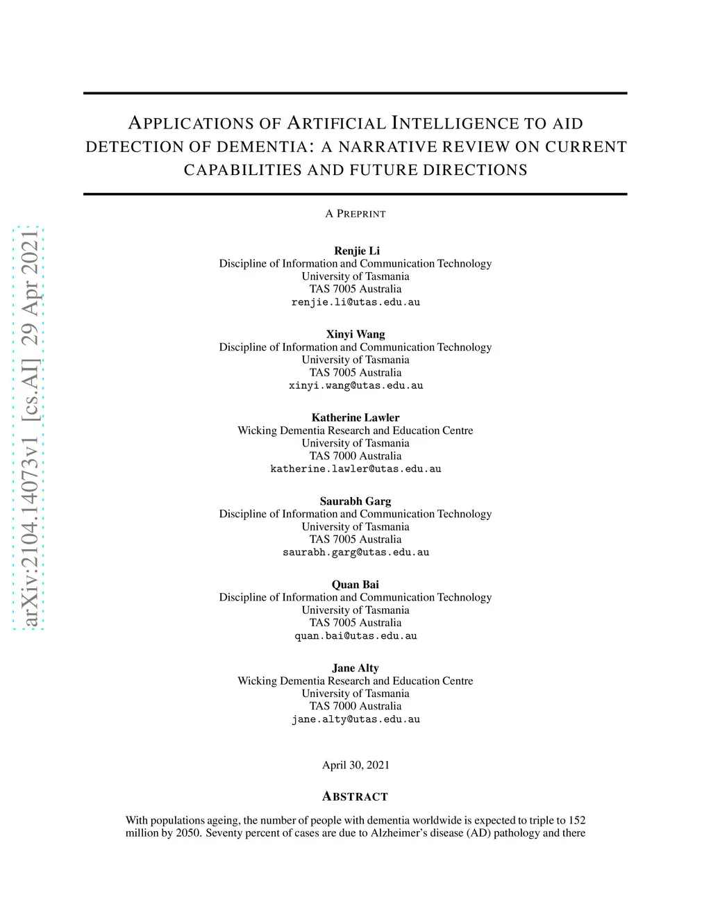 With populations ageing, the number of people with dementia worldwide is expected to triple to 152 million by 2050. Seventy percent of cases are due to Alzheimer's disease (AD) pathology and there is a 10-20 year 'pre-clinical' period before significant cognitive decline occurs. We urgently need, cost effective, objective methods to detect AD, and other dementias, at an early stage. Risk factor modification could prevent 40% of cases and drug trials would have greater chances of success if participants are recruited at an earlier stage. Currently, detection of dementia is largely by pen and paper cognitive tests but these are time consuming and insensitive to pre-clinical phases. Specialist brain scans and body fluid biomarkers can detect the earliest stages of dementia but are too invasive or expensive for widespread use. With the advancement of technology, Artificial Intelligence (AI) shows promising results in assisting with detection of early-stage dementia. Existing AI-aided methods and potential future research directions are reviewed and discussed.