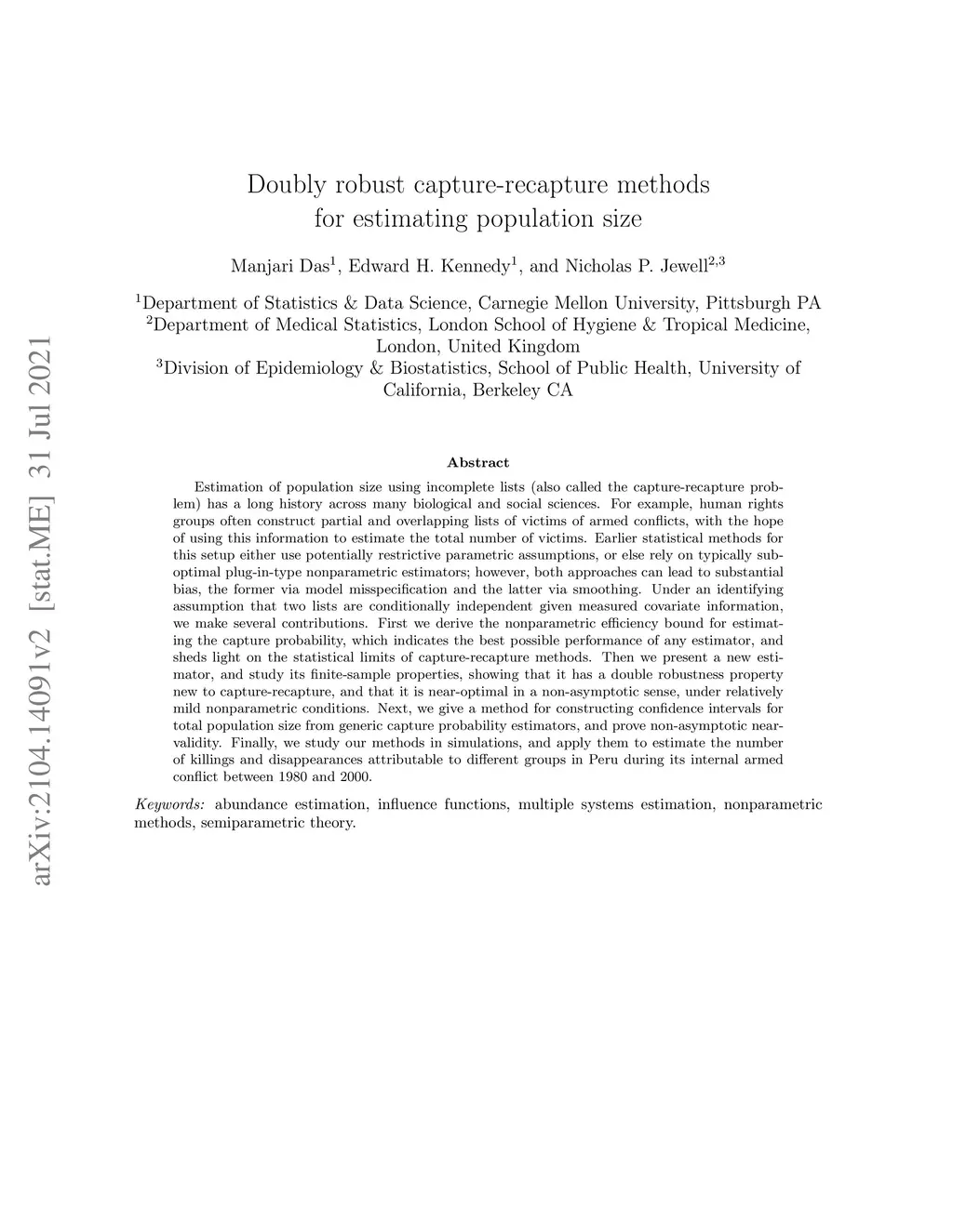 Estimation of population size using incomplete lists (also called the capture-recapture problem) has a long history across many biological and social sciences. For example, human rights and other groups often construct partial and overlapping lists of victims of armed conflicts, with the hope of using this information to estimate the total number of victims. Earlier statistical methods for this setup either use potentially restrictive parametric assumptions, or else rely on typically suboptimal plug-in-type nonparametric estimators; however, both approaches can lead to substantial bias, the former via model misspecification and the latter via smoothing. Under an identifying assumption that two lists are conditionally independent given measured covariate information, we make several contributions. First, we derive the nonparametric efficiency bound for estimating the capture probability, which indicates the best possible performance of any estimator, and sheds light on the statistical limits of capture-recapture methods. Then we present a new estimator, and study its finite-sample properties, showing that it has a double robustness property new to capture-recapture, and that it is near-optimal in a non-asymptotic sense, under relatively mild nonparametric conditions. Next, we give a method for constructing confidence intervals for total population size from generic capture probability estimators, and prove non-asymptotic near-validity. Finally, we study our methods in simulations, and apply them to estimate the number of killings and disappearances attributable to different groups in Peru during its internal armed conflict between 1980 and 2000.