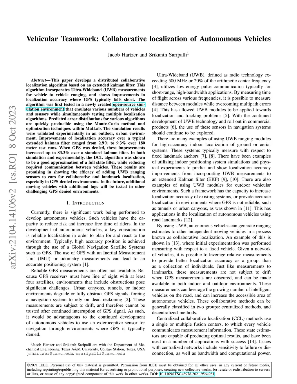 This paper develops a distributed collaborative localization algorithm based on an extended kalman filter. This algorithm incorporates Ultra-Wideband (UWB) measurements for vehicle to vehicle ranging, and shows improvements in localization accuracy where GPS typically falls short. The algorithm was first tested in a newly created open-source simulation environment that emulates various numbers of vehicles and sensors while simultaneously testing multiple localization algorithms. Predicted error distributions for various algorithms are quickly producible using the Monte-Carlo method and optimization techniques within MatLab. The simulation results were validated experimentally in an outdoor, urban environment. Improvements of localization accuracy over a typical extended kalman filter ranged from 2.9% to 9.3% over 180 meter test runs. When GPS was denied, these improvements increased up to 83.3% over a standard kalman filter. In both simulation and experimentally, the DCL algorithm was shown to be a good approximation of a full state filter, while reducing required communication between vehicles. These results are promising in showing the efficacy of adding UWB ranging sensors to cars for collaborative and landmark localization, especially in GPS-denied environments. In the future, additional moving vehicles with additional tags will be tested in other challenging GPS denied environments.