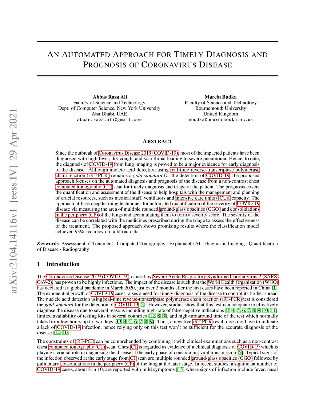 Since the outbreak of Coronavirus Disease 2019 (COVID-19), most of the impacted patients have been diagnosed with high fever, dry cough, and soar throat leading to severe pneumonia. Hence, to date, the diagnosis of COVID-19 from lung imaging is proved to be a major evidence for early diagnosis of the disease. Although nucleic acid detection using real-time reverse-transcriptase polymerase chain reaction (rRT-PCR) remains a gold standard for the detection of COVID-19, the proposed approach focuses on the automated diagnosis and prognosis of the disease from a non-contrast chest computed tomography (CT)scan for timely diagnosis and triage of the patient. The prognosis covers the quantification and assessment of the disease to help hospitals with the management and planning of crucial resources, such as medical staff, ventilators and intensive care units (ICUs) capacity. The approach utilises deep learning techniques for automated quantification of the severity of COVID-19 disease via measuring the area of multiple rounded ground-glass opacities (GGO) and consolidations in the periphery (CP) of the lungs and accumulating them to form a severity score. The severity of the disease can be correlated with the medicines prescribed during the triage to assess the effectiveness of the treatment. The proposed approach shows promising results where the classification model achieved 93% accuracy on hold-out data.