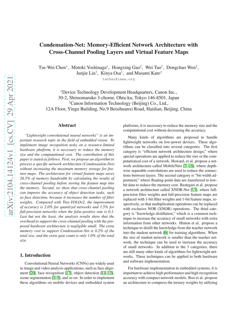"Lightweight convolutional neural networks" is an important research topic in the field of embedded vision. To implement image recognition tasks on a resource-limited hardware platform, it is necessary to reduce the memory size and the computational cost. The contribution of this paper is stated as follows. First, we propose an algorithm to process a specific network architecture (Condensation-Net) without increasing the maximum memory storage for feature maps. The architecture for virtual feature maps saves 26.5% of memory bandwidth by calculating the results of cross-channel pooling before storing the feature map into the memory. Second, we show that cross-channel pooling can improve the accuracy of object detection tasks, such as face detection, because it increases the number of filter weights. Compared with Tiny-YOLOv2, the improvement of accuracy is 2.0% for quantized networks and 1.5% for full-precision networks when the false-positive rate is 0.1. Last but not the least, the analysis results show that the overhead to support the cross-channel pooling with the proposed hardware architecture is negligible small. The extra memory cost to support Condensation-Net is 0.2% of the total size, and the extra gate count is only 1.0% of the total size.