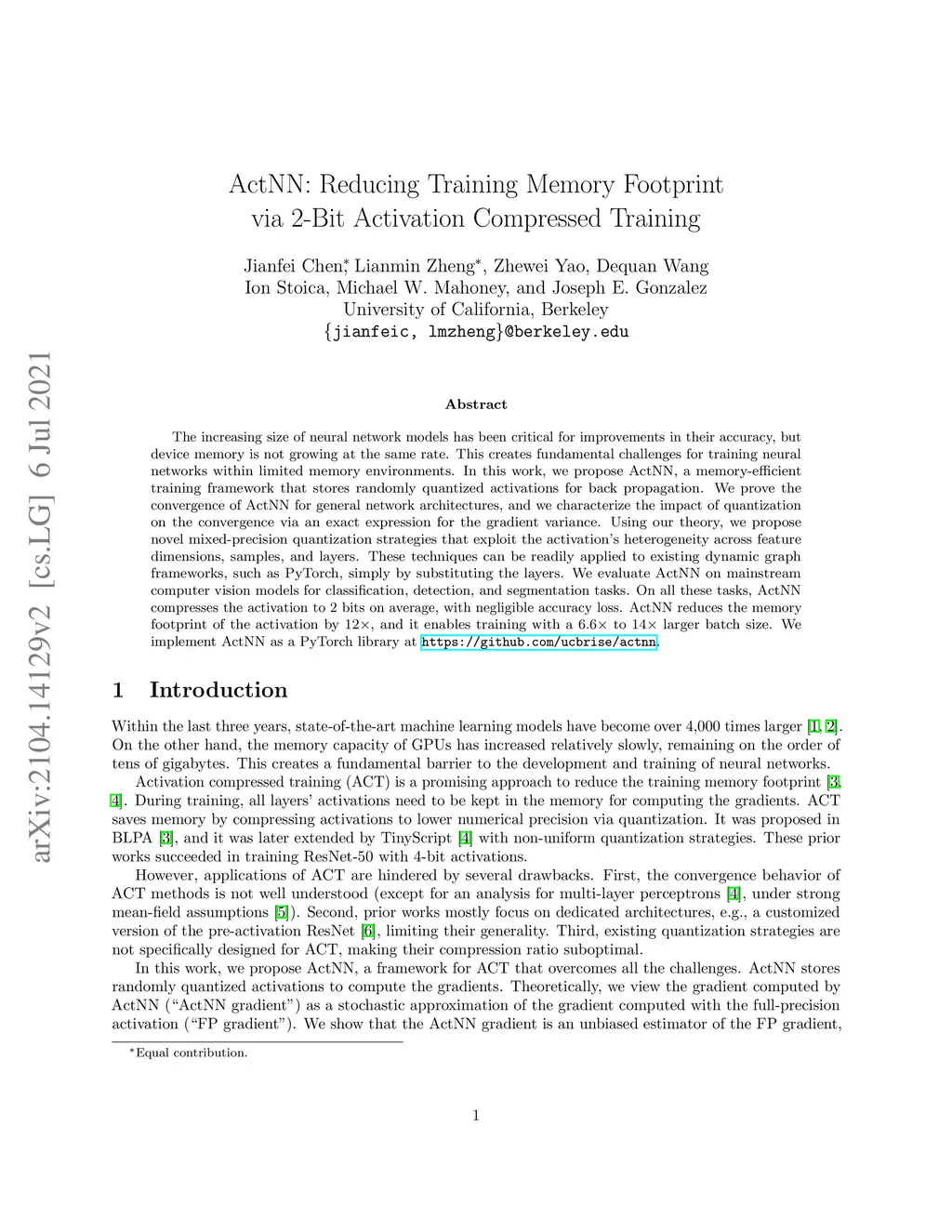 ActNN: Reducing Training Memory Footprint via 2-Bit Activation