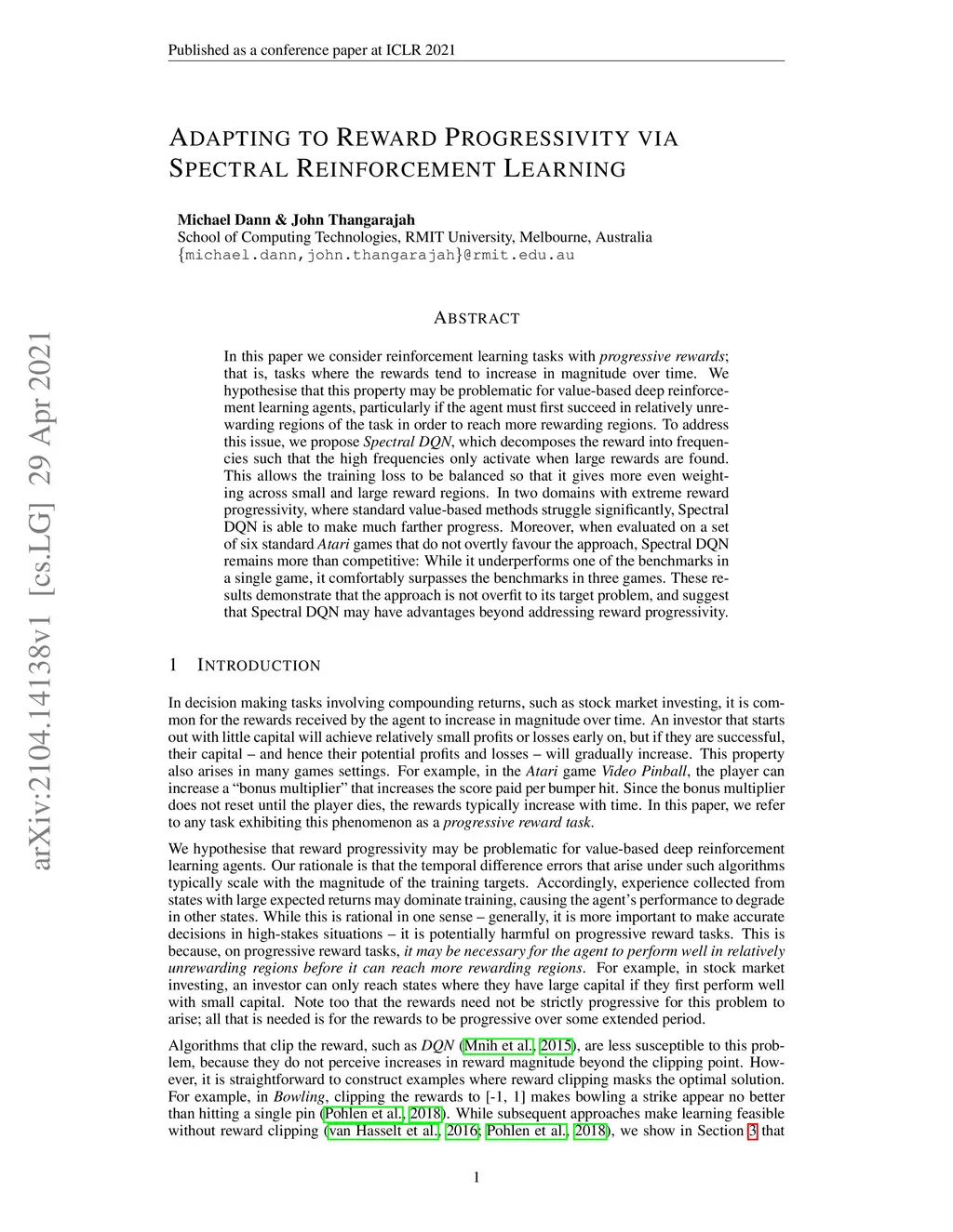 In this paper we consider reinforcement learning tasks with progressive rewards; that is, tasks where the rewards tend to increase in magnitude over time. We hypothesise that this property may be problematic for value-based deep reinforcement learning agents, particularly if the agent must first succeed in relatively unrewarding regions of the task in order to reach more rewarding regions. To address this issue, we propose Spectral DQN, which decomposes the reward into frequencies such that the high frequencies only activate when large rewards are found. This allows the training loss to be balanced so that it gives more even weighting across small and large reward regions. In two domains with extreme reward progressivity, where standard value-based methods struggle significantly, Spectral DQN is able to make much farther progress. Moreover, when evaluated on a set of six standard Atari games that do not overtly favour the approach, Spectral DQN remains more than competitive: While it underperforms one of the benchmarks in a single game, it comfortably surpasses the benchmarks in three games. These results demonstrate that the approach is not overfit to its target problem, and suggest that Spectral DQN may have advantages beyond addressing reward progressivity.