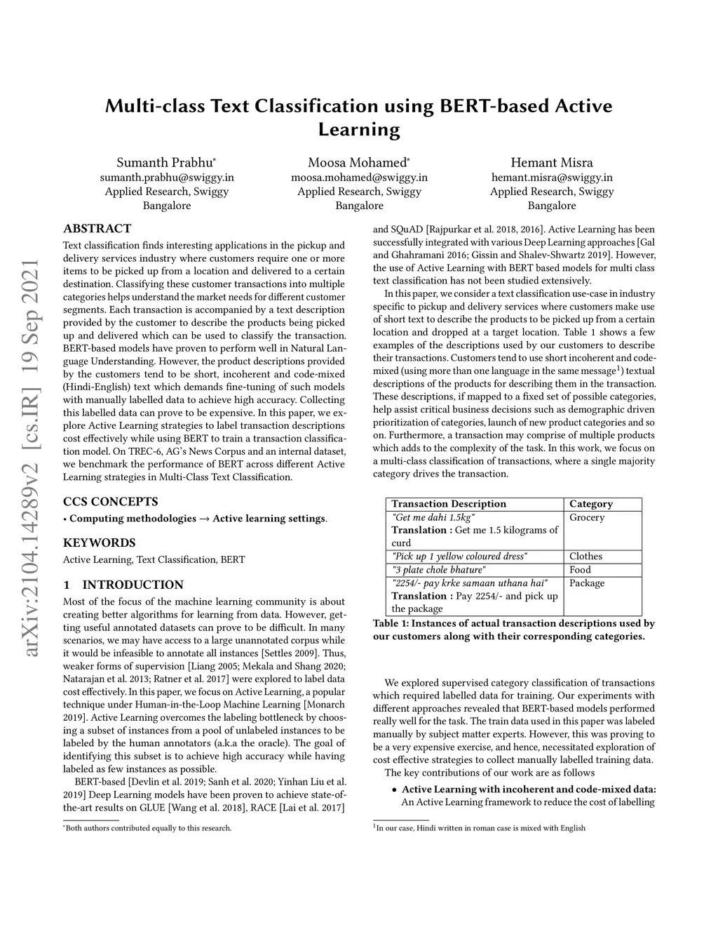 Text Classification finds interesting applications in the pickup and delivery services industry where customers require one or more items to be picked up from a location and delivered to a certain destination. Classifying these customer transactions into multiple categories helps understand the market needs for different customer segments. Each transaction is accompanied by a text description provided by the customer to describe the products being picked up and delivered which can be used to classify the transaction. BERT-based models have proven to perform well in Natural Language Understanding. However, the product descriptions provided by the customers tend to be short, incoherent and code-mixed (Hindi-English) text which demands fine-tuning of such models with manually labelled data to achieve high accuracy. Collecting this labelled data can prove to be expensive. In this paper, we explore Active Learning strategies to label transaction descriptions cost effectively while using BERT to train a transaction classification model. On TREC-6, AG's News Corpus and an internal dataset, we benchmark the performance of BERT across different Active Learning strategies in Multi-Class Text Classification.