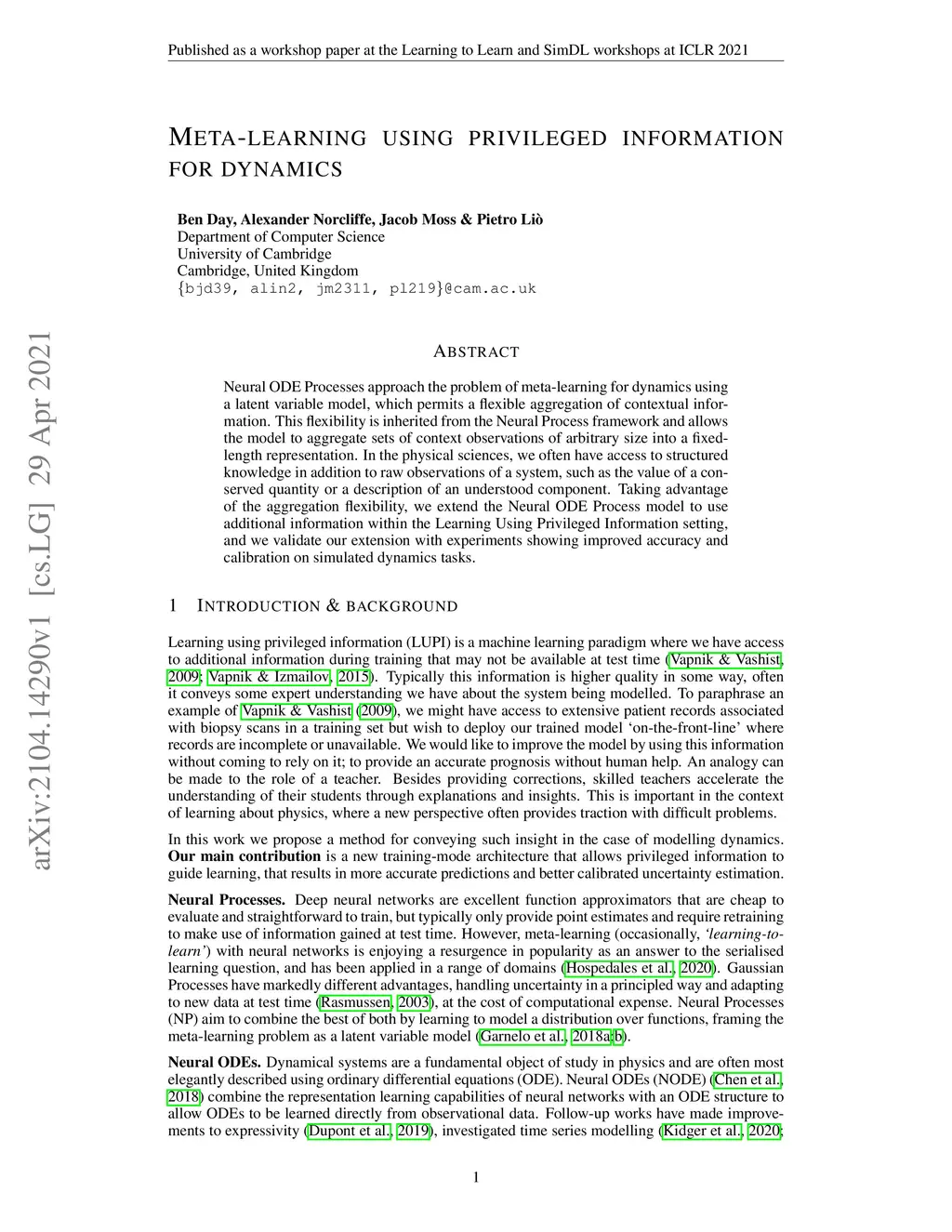 Neural ODE Processes approach the problem of meta-learning for dynamics using a latent variable model, which permits a flexible aggregation of contextual information. This flexibility is inherited from the Neural Process framework and allows the model to aggregate sets of context observations of arbitrary size into a fixed-length representation. In the physical sciences, we often have access to structured knowledge in addition to raw observations of a system, such as the value of a conserved quantity or a description of an understood component. Taking advantage of the aggregation flexibility, we extend the Neural ODE Process model to use additional information within the Learning Using Privileged Information setting, and we validate our extension with experiments showing improved accuracy and calibration on simulated dynamics tasks.