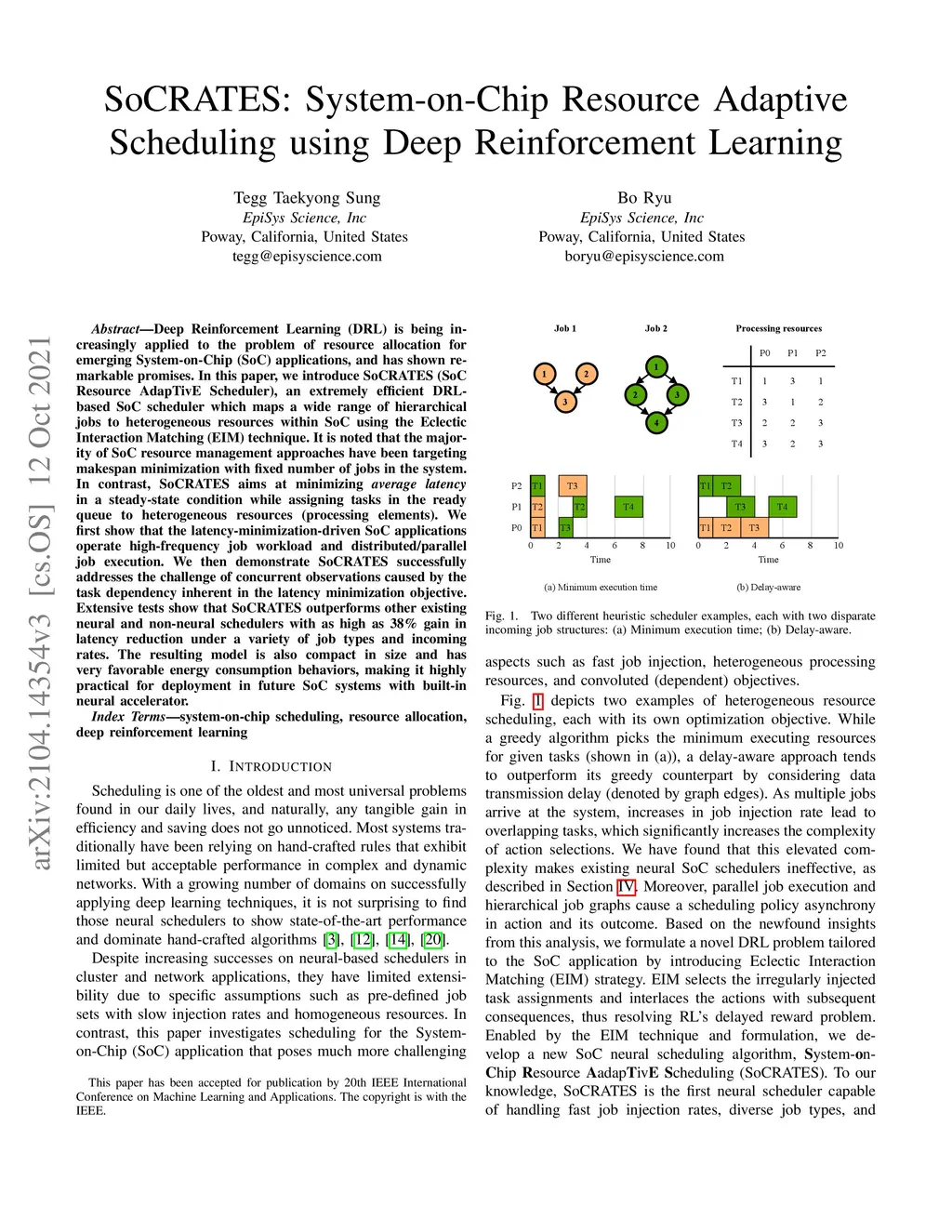 Deep Reinforcement Learning (DRL) is being increasingly applied to the problem of resource allocation for emerging System-on-Chip (SoC) applications, and has shown remarkable promises. In this paper, we introduce SoCRATES (SoC Resource AdapTivE Scheduler), an extremely efficient DRL-based SoC scheduler which maps a wide range of hierarchical jobs to heterogeneous resources within SoC using the Eclectic Interaction Matching (EIM) technique. It is noted that the majority of SoC resource management approaches have been targeting makespan minimization with fixed number of jobs in the system. In contrast, SoCRATES aims at minimizing average latency in a steady-state condition while assigning tasks in the ready queue to heterogeneous resources (processing elements). We first show that the latency-minimization-driven SoC applications operate high-frequency job workload and distributed/parallel job execution. We then demonstrate SoCRATES successfully addresses the challenge of concurrent observations caused by the task dependency inherent in the latency minimization objective. Extensive tests show that SoCRATES outperforms other existing neural and non-neural schedulers with as high as 38% gain in latency reduction under a variety of job types and incoming rates. The resulting model is also compact in size and has very favorable energy consumption behaviors, making it highly practical for deployment in future SoC systems with built-in neural accelerator.