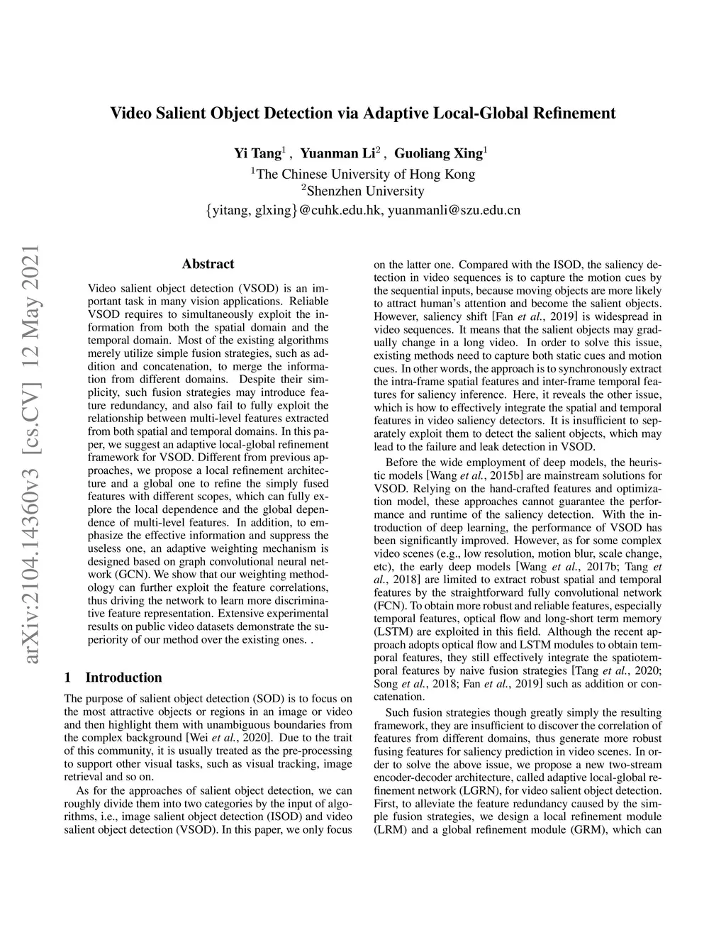 Video Salient Object Detection via Adaptive Local-Global Refinement