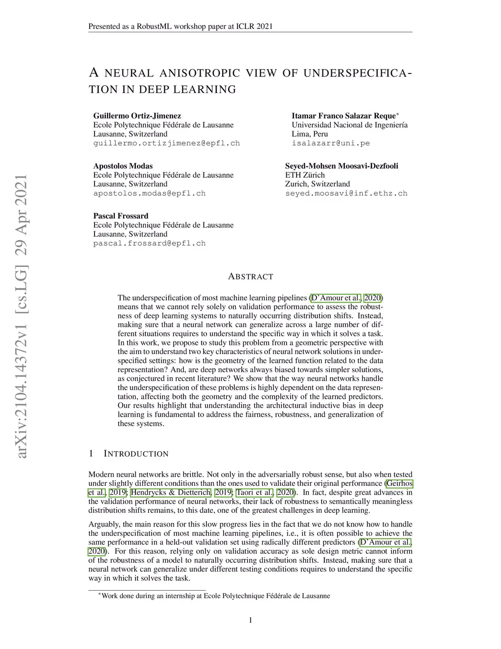 The underspecification of most machine learning pipelines means that we cannot rely solely on validation performance to assess the robustness of deep learning systems to naturally occurring distribution shifts. Instead, making sure that a neural network can generalize across a large number of different situations requires to understand the specific way in which it solves a task. In this work, we propose to study this problem from a geometric perspective with the aim to understand two key characteristics of neural network solutions in underspecified settings: how is the geometry of the learned function related to the data representation? And, are deep networks always biased towards simpler solutions, as conjectured in recent literature? We show that the way neural networks handle the underspecification of these problems is highly dependent on the data representation, affecting both the geometry and the complexity of the learned predictors. Our results highlight that understanding the architectural inductive bias in deep learning is fundamental to address the fairness, robustness, and generalization of these systems.