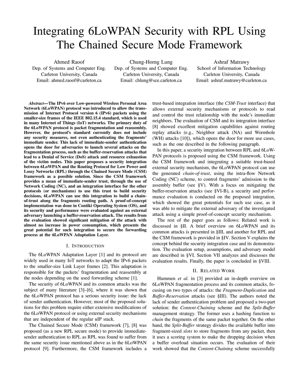 The IPv6 over Low-powered Wireless Personal Area Network (6LoWPAN) protocol was introduced to allow the transmission of Internet Protocol version 6 (IPv6) packets using the smaller-size frames of the IEEE 802.15.4 standard, which is used in many Internet of Things (IoT) networks. The primary duty of the 6LoWPAN protocol is packet fragmentation and reassembly. However, the protocol standard currently does not include any security measures, not even authenticating the fragments immediate sender. This lack of immediate-sender authentication opens the door for adversaries to launch several attacks on the fragmentation process, such as the buffer-reservation attacks that lead to a Denial of Service (DoS) attack and resource exhaustion of the victim nodes. This paper proposes a security integration between 6LoWPAN and the Routing Protocol for Low Power and Lossy Networks (RPL) through the Chained Secure Mode (CSM) framework as a possible solution. Since the CSM framework provides a mean of immediate-sender trust, through the use of Network Coding (NC), and an integration interface for the other protocols (or mechanisms) to use this trust to build security decisions, 6LoWPAN can use this integration to build a chain-of-trust along the fragments routing path. A proof-of-concept implementation was done in Contiki Operating System (OS), and its security and performance were evaluated against an external adversary launching a buffer-reservation attack. The results from the evaluation showed significant mitigation of the attack with almost no increase in power consumption, which presents the great potential for such integration to secure the forwarding process at the 6LoWPAN Adaptation Layer