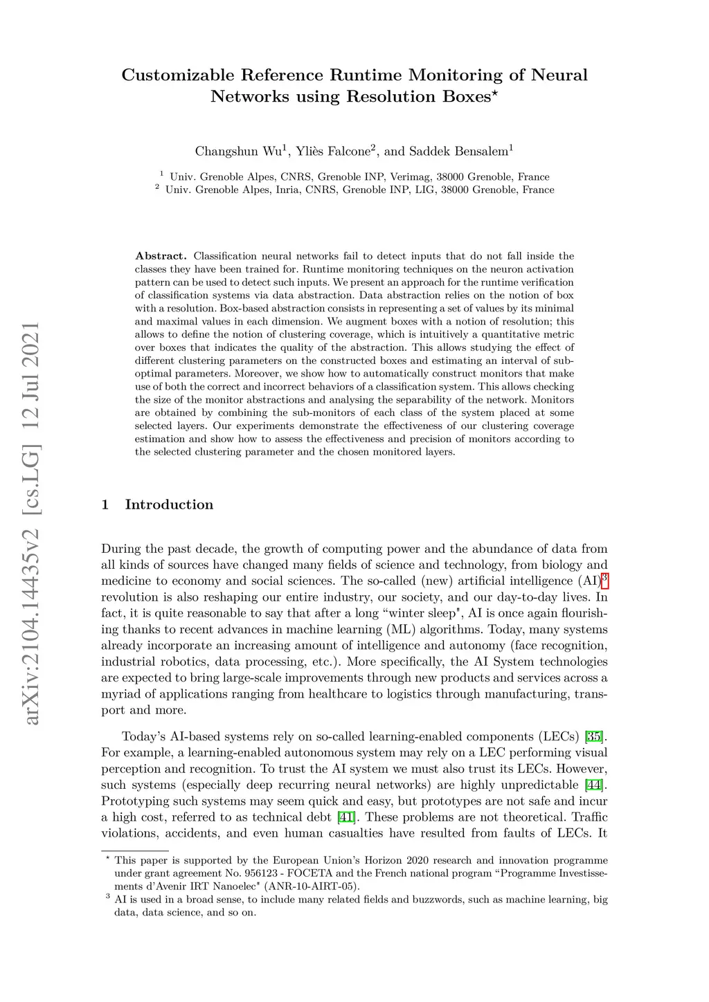 Classification neural networks fail to detect inputs that do not fall inside the classes they have been trained for. Runtime monitoring techniques on the neuron activation pattern can be used to detect such inputs. We present an approach for monitoring classification systems via data abstraction. Data abstraction relies on the notion of box with a resolution. Box-based abstraction consists in representing a set of values by its minimal and maximal values in each dimension. We augment boxes with a notion of resolution and define their clustering coverage, which is intuitively a quantitative metric that indicates the abstraction quality. This allows studying the effect of different clustering parameters on the constructed boxes and estimating an interval of sub-optimal parameters. Moreover, we automatically construct monitors that leverage both the correct and incorrect behaviors of a system. This allows checking the size of the monitor abstractions and analyzing the separability of the network. Monitors are obtained by combining the sub-monitors of each class of the system placed at some selected layers. Our experiments demonstrate the effectiveness of our clustering coverage estimation and show how to assess the effectiveness and precision of monitors according to the selected clustering parameter and monitored layers.