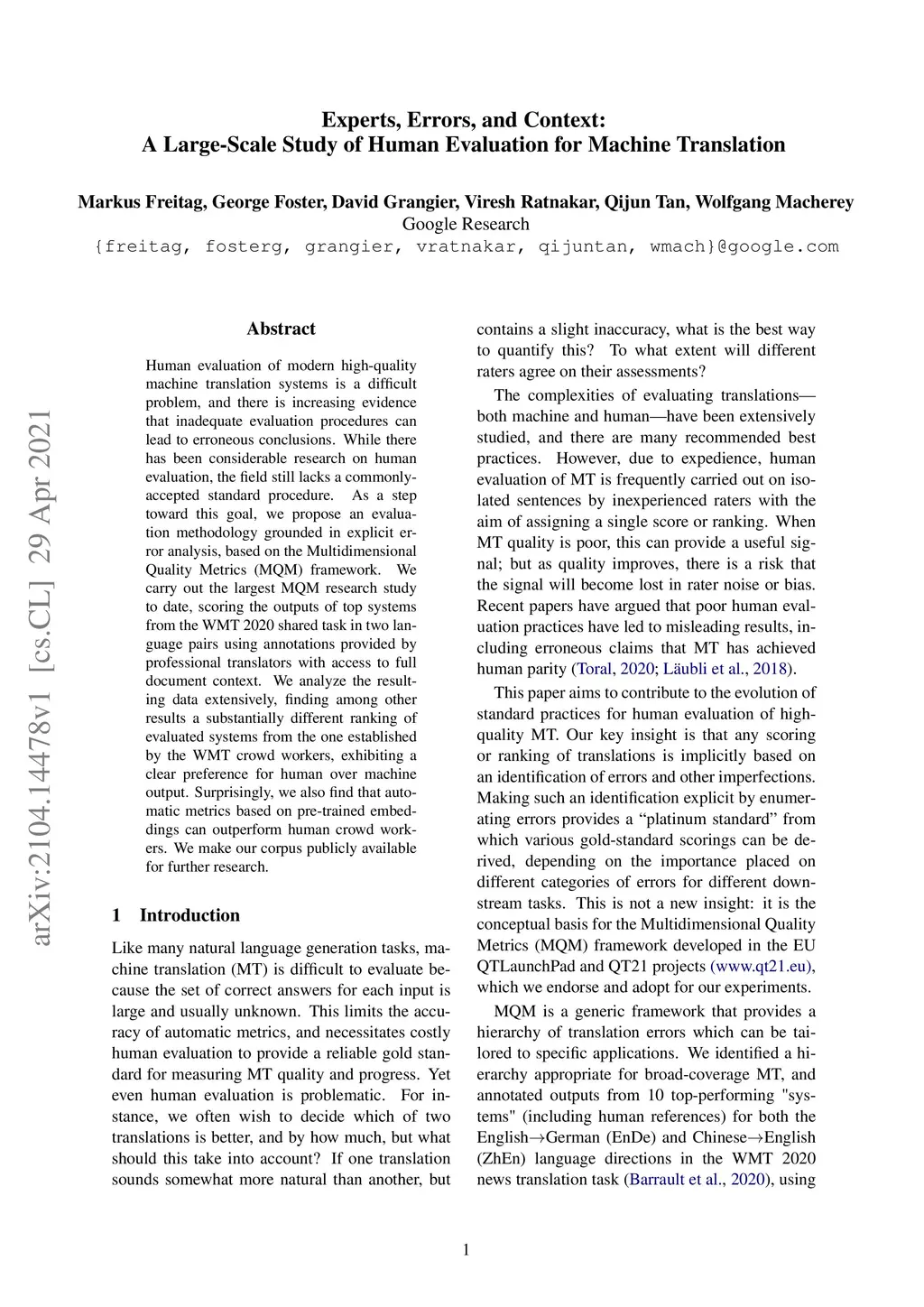 Human evaluation of modern high-quality machine translation systems is a difficult problem, and there is increasing evidence that inadequate evaluation procedures can lead to erroneous conclusions. While there has been considerable research on human evaluation, the field still lacks a commonly-accepted standard procedure. As a step toward this goal, we propose an evaluation methodology grounded in explicit error analysis, based on the Multidimensional Quality Metrics (MQM) framework. We carry out the largest MQM research study to date, scoring the outputs of top systems from the WMT 2020 shared task in two language pairs using annotations provided by professional translators with access to full document context. We analyze the resulting data extensively, finding among other results a substantially different ranking of evaluated systems from the one established by the WMT crowd workers, exhibiting a clear preference for human over machine output. Surprisingly, we also find that automatic metrics based on pre-trained embeddings can outperform human crowd workers. We make our corpus publicly available for further research.