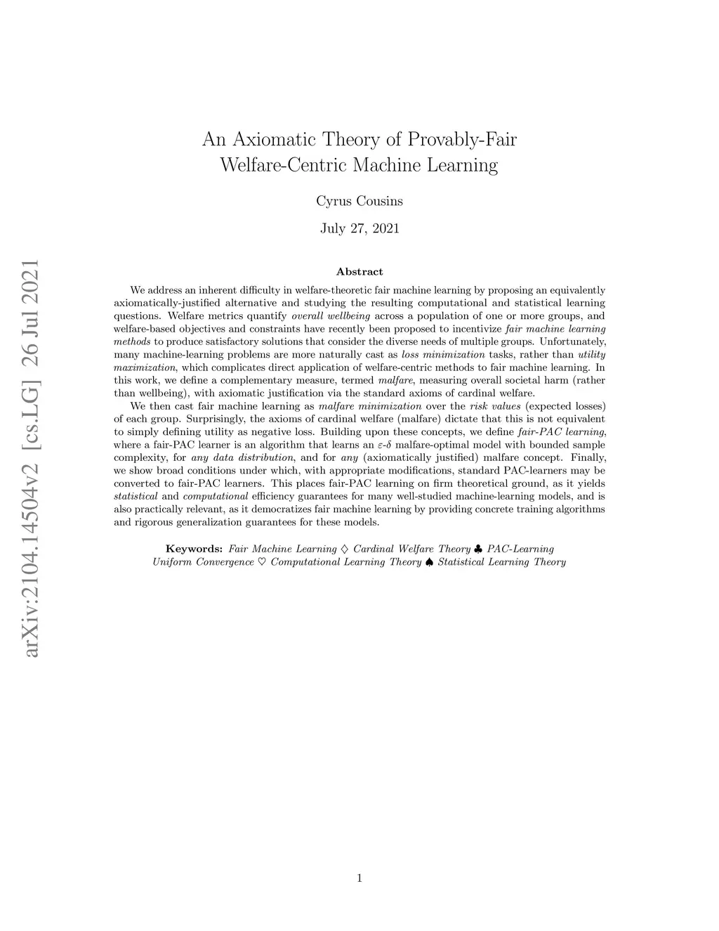 We address an inherent difficulty in welfare-theoretic fair machine learning by proposing an equivalently axiomatically-justified alternative and studying the resulting computational and statistical learning questions. Welfare metrics quantify overall wellbeing across a population of one or more groups, and welfare-based objectives and constraints have recently been proposed to incentivize fair machine learning methods to produce satisfactory solutions that consider the diverse needs of multiple groups. Unfortunately, many machine-learning problems are more naturally cast as loss minimization tasks, rather than utility maximization, which complicates direct application of welfare-centric methods to fair machine learning. In this work, we define a complementary measure, termed malfare, measuring overall societal harm (rather than wellbeing), with axiomatic justification via the standard axioms of cardinal welfare. We then cast fair machine learning as malfare minimization over the risk values (expected losses) of each group. Surprisingly, the axioms of cardinal welfare (malfare) dictate that this is not equivalent to simply defining utility as negative loss. Building upon these concepts, we define fair-PAC (FPAC) learning, where an FPAC learner is an algorithm that learns an - malfare-optimal model with bounded sample complexity, for any data distribution, and for any (axiomatically justified) malfare concept. Finally, we show broad conditions under which, with appropriate modifications, standard PAC-learners may be converted to FPAC learners. This places FPAC learning on firm theoretical ground, as it yields statistical and computational efficiency guarantees for many well-studied machine-learning models, and is also practically relevant, as it democratizes fair ML by providing concrete training algorithms and rigorous generalization guarantees for these models