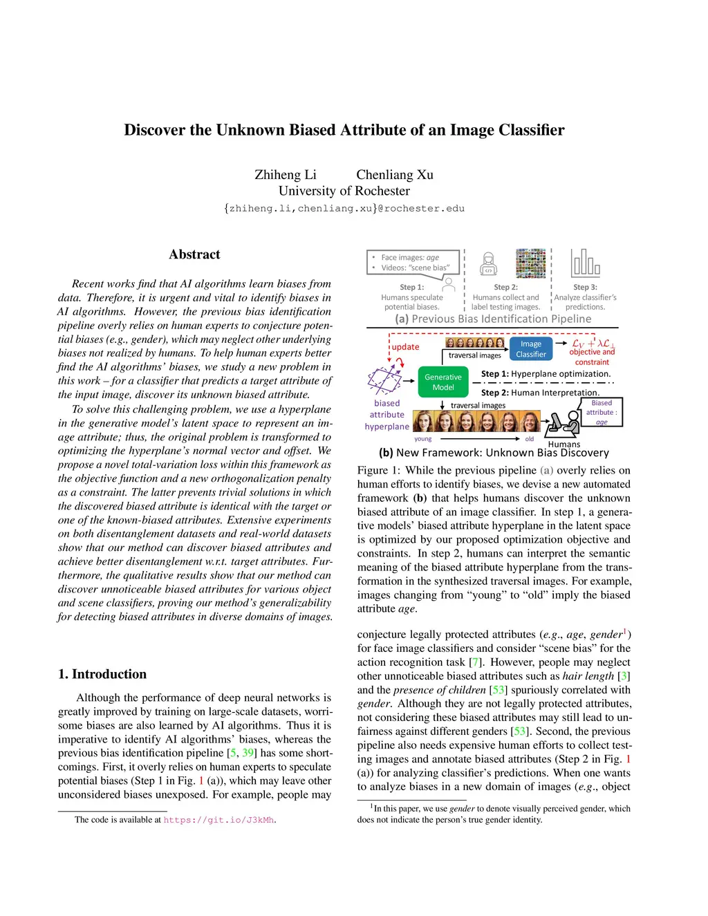 Recent works find that AI algorithms learn biases from data. Therefore, it is urgent and vital to identify biases in AI algorithms. However, the previous bias identification pipeline overly relies on human experts to conjecture potential biases (e.g., gender), which may neglect other underlying biases not realized by humans. To help human experts better find the AI algorithms' biases, we study a new problem in this work -- for a classifier that predicts a target attribute of the input image, discover its unknown biased attribute. To solve this challenging problem, we use a hyperplane in the generative model's latent space to represent an image attribute; thus, the original problem is transformed to optimizing the hyperplane's normal vector and offset. We propose a novel total-variation loss within this framework as the objective function and a new orthogonalization penalty as a constraint. The latter prevents trivial solutions in which the discovered biased attribute is identical with the target or one of the known-biased attributes. Extensive experiments on both disentanglement datasets and real-world datasets show that our method can discover biased attributes and achieve better disentanglement w.r.t. target attributes. Furthermore, the qualitative results show that our method can discover unnoticeable biased attributes for various object and scene classifiers, proving our method's generalizability for detecting biased attributes in diverse domains of images. The code is available at https://git.io/J3kMh.