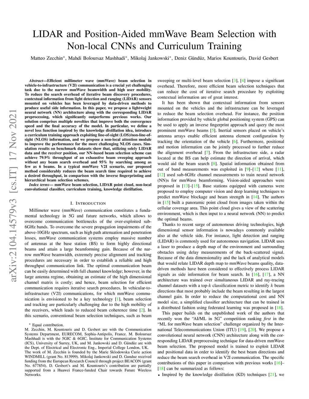 Efficient millimeter wave (mmWave) beam selection in vehicle-to-infrastructure (V2I) communication is a crucial yet challenging task due to the narrow mmWave beamwidth and high user mobility. To reduce the search overhead of iterative beam discovery procedures, contextual information from light detection and ranging (LIDAR) sensors mounted on vehicles has been leveraged by data-driven methods to produce useful side information. In this paper, we propose a lightweight neural network (NN) architecture along with the corresponding LIDAR preprocessing, which significantly outperforms previous works. Our solution comprises multiple novelties that improve both the convergence speed and the final accuracy of the model. In particular, we define a novel loss function inspired by the knowledge distillation idea, introduce a curriculum training approach exploiting line-of-sight (LOS)/non-line-of-sight (NLOS) information, and we propose a non-local attention module to improve the performance for the more challenging NLOS cases. Simulation results on benchmark datasets show that, utilizing solely LIDAR data and the receiver position, our NN-based beam selection scheme can achieve 79.9% throughput of an exhaustive beam sweeping approach without any beam search overhead and 95% by searching among as few as 6 beams. In a typical mmWave V2I scenario, our proposed method considerably reduces the beam search time required to achieve a desired throughput, in comparison with the inverse fingerprinting and hierarchical beam selection schemes.