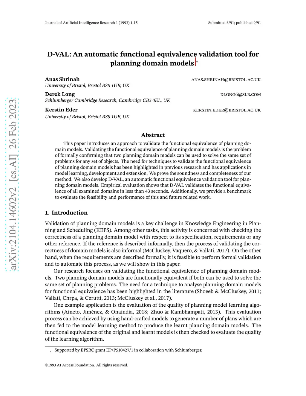 This paper introduces an approach to validate the functional equivalence of planning domain models. Validating the functional equivalence of planning domain models is the problem of formally confirming that two planning domain models can be used to solve the same set of problems for any set of objects. The need for techniques to validate the functional equivalence of planning domain models has been highlighted in previous research and has applications in model learning, development and extension. We prove the soundness and completeness of our method. We also develop D-VAL, an automatic functional equivalence validation tool for planning domain models. Empirical evaluation shows that D-VAL validates the functional equivalence of all examined domains in less than 43 seconds. Additionally, we provide a benchmark to evaluate the feasibility and performance of this and future related work.