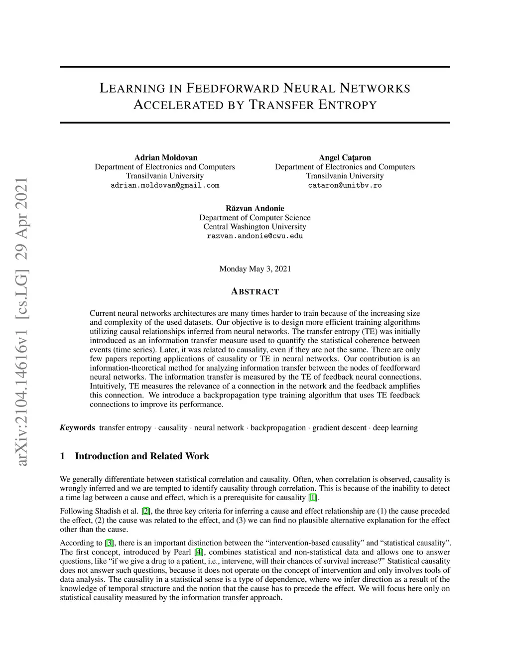 Learning in Feedforward Neural Networks Accelerated by Transfer Entropy