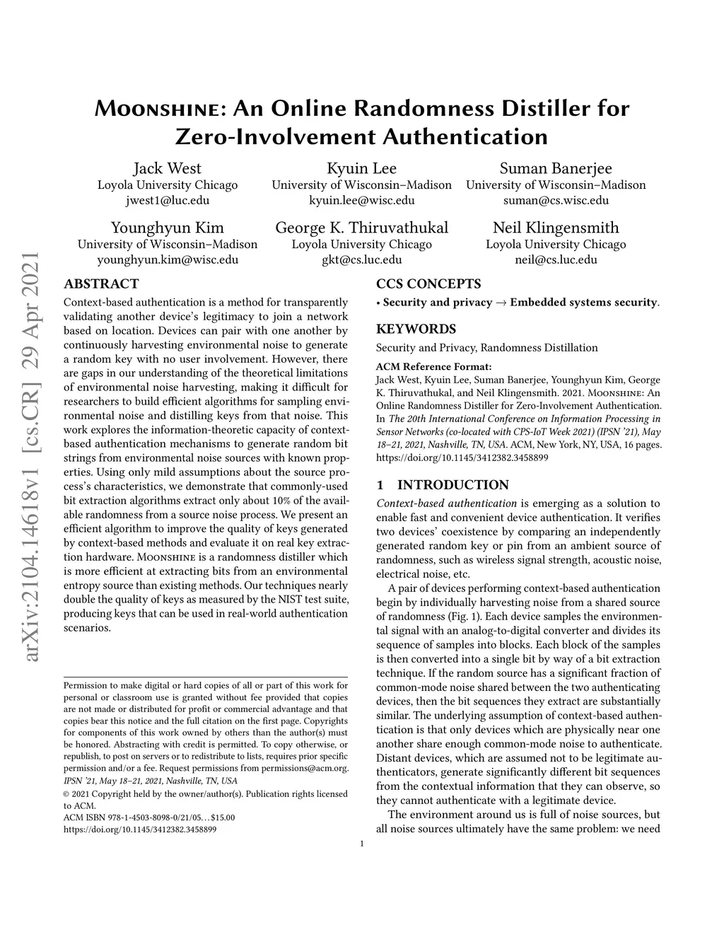 Context-based authentication is a method for transparently validating another device's legitimacy to join a network based on location. Devices can pair with one another by continuously harvesting environmental noise to generate a random key with no user involvement. However, there are gaps in our understanding of the theoretical limitations of environmental noise harvesting, making it difficult for researchers to build efficient algorithms for sampling environmental noise and distilling keys from that noise. This work explores the information-theoretic capacity of context-based authentication mechanisms to generate random bit strings from environmental noise sources with known properties. Using only mild assumptions about the source process's characteristics, we demonstrate that commonly-used bit extraction algorithms extract only about 10% of the available randomness from a source noise process. We present an efficient algorithm to improve the quality of keys generated by context-based methods and evaluate it on real key extraction hardware. Moonshine is a randomness distiller which is more efficient at extracting bits from an environmental entropy source than existing methods. Our techniques nearly double the quality of keys as measured by the NIST test suite, producing keys that can be used in real-world authentication scenarios.