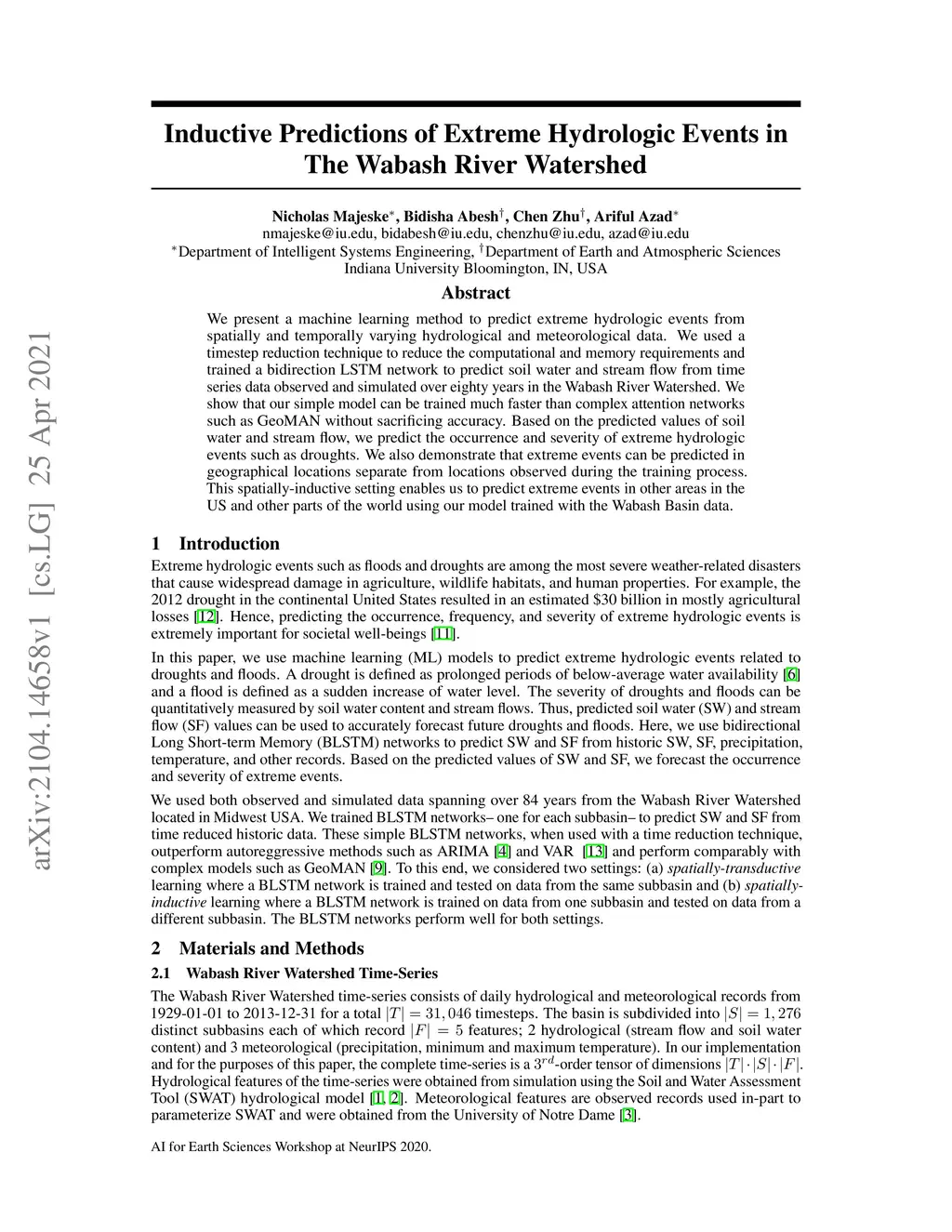 We present a machine learning method to predict extreme hydrologic events from spatially and temporally varying hydrological and meteorological data. We used a timestep reduction technique to reduce the computational and memory requirements and trained a bidirection LSTM network to predict soil water and stream flow from time series data observed and simulated over eighty years in the Wabash River Watershed. We show that our simple model can be trained much faster than complex attention networks such as GeoMAN without sacrificing accuracy. Based on the predicted values of soil water and stream flow, we predict the occurrence and severity of extreme hydrologic events such as droughts. We also demonstrate that extreme events can be predicted in geographical locations separate from locations observed during the training process. This spatially-inductive setting enables us to predict extreme events in other areas in the US and other parts of the world using our model trained with the Wabash Basin data.