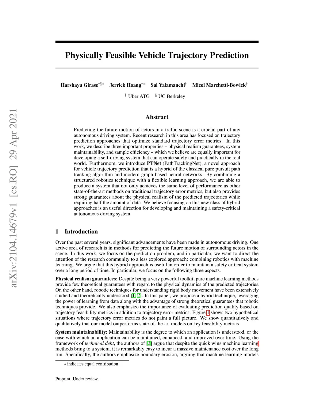 Predicting the future motion of actors in a traffic scene is a crucial part of any autonomous driving system. Recent research in this area has focused on trajectory prediction approaches that optimize standard trajectory error metrics. In this work, we describe three important properties -- physical realism guarantees, system maintainability, and sample efficiency -- which we believe are equally important for developing a self-driving system that can operate safely and practically in the real world. Furthermore, we introduce PTNet (PathTrackingNet), a novel approach for vehicle trajectory prediction that is a hybrid of the classical pure pursuit path tracking algorithm and modern graph-based neural networks. By combining a structured robotics technique with a flexible learning approach, we are able to produce a system that not only achieves the same level of performance as other state-of-the-art methods on traditional trajectory error metrics, but also provides strong guarantees about the physical realism of the predicted trajectories while requiring half the amount of data. We believe focusing on this new class of hybrid approaches is an useful direction for developing and maintaining a safety-critical autonomous driving system.