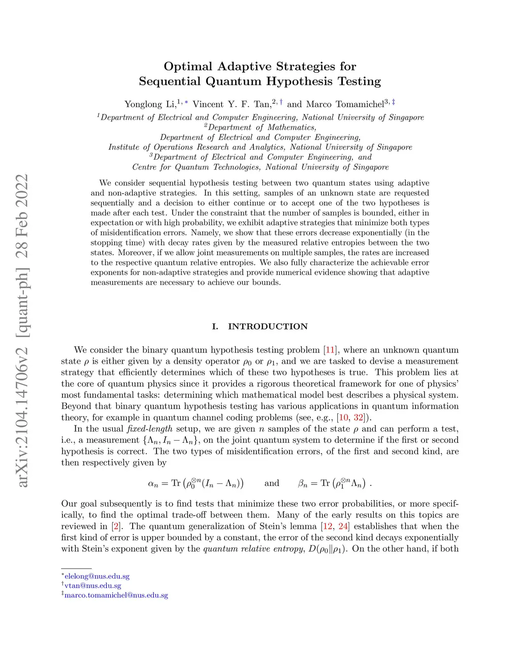 Optimal Adaptive Strategies for Sequential Quantum Hypothesis Testing