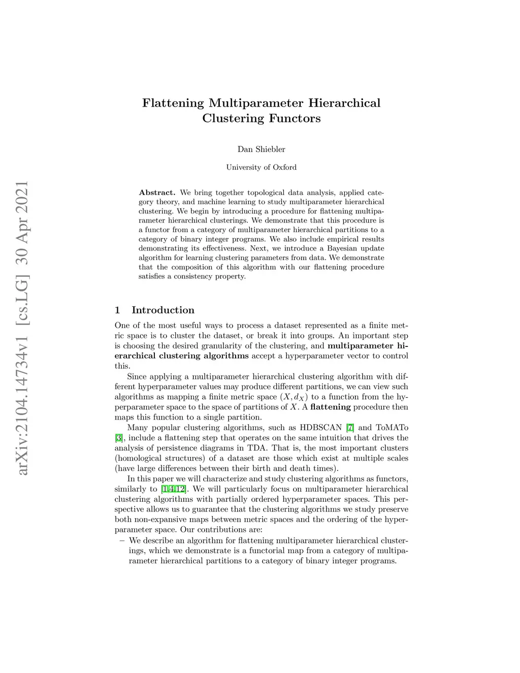 We bring together topological data analysis, applied category theory, and machine learning to study multiparameter hierarchical clustering. We begin by introducing a procedure for flattening multiparameter hierarchical clusterings. We demonstrate that this procedure is a functor from a category of multiparameter hierarchical partitions to a category of binary integer programs. We also include empirical results demonstrating its effectiveness. Next, we introduce a Bayesian update algorithm for learning clustering parameters from data. We demonstrate that the composition of this algorithm with our flattening procedure satisfies a consistency property.