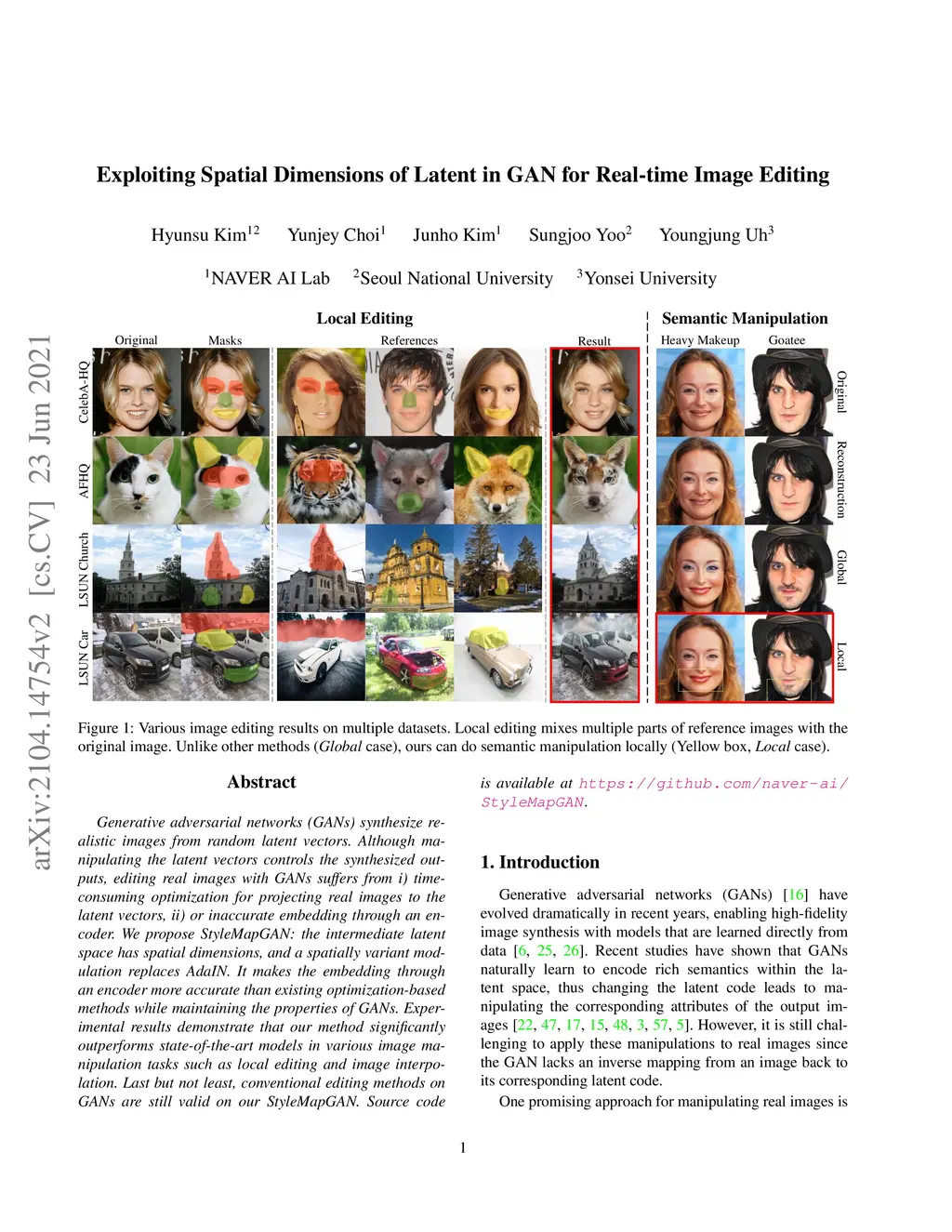 Generative adversarial networks (GANs) synthesize realistic images from random latent vectors. Although manipulating the latent vectors controls the synthesized outputs, editing real images with GANs suffers from i) time-consuming optimization for projecting real images to the latent vectors, ii) or inaccurate embedding through an encoder. We propose StyleMapGAN: the intermediate latent space has spatial dimensions, and a spatially variant modulation replaces AdaIN. It makes the embedding through an encoder more accurate than existing optimization-based methods while maintaining the properties of GANs. Experimental results demonstrate that our method significantly outperforms state-of-the-art models in various image manipulation tasks such as local editing and image interpolation. Last but not least, conventional editing methods on GANs are still valid on our StyleMapGAN. Source code is available at https://github.com/naver-ai/StyleMapGAN.