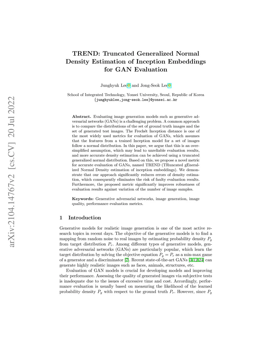 Evaluating image generation models such as generative adversarial networks (GANs) is a challenging problem. A common approach is to compare the distributions of the set of ground truth images and the set of generated test images. The Frech\ét Inception distance is one of the most widely used metrics for evaluation of GANs, which assumes that the features from a trained Inception model for a set of images follow a normal distribution. In this paper, we argue that this is an over-simplified assumption, which may lead to unreliable evaluation results, and more accurate density estimation can be achieved using a truncated generalized normal distribution. Based on this, we propose a novel metric for accurate evaluation of GANs, named TREND (TRuncated gEneralized Normal Density estimation of inception embeddings). We demonstrate that our approach significantly reduces errors of density estimation, which consequently eliminates the risk of faulty evaluation results. Furthermore, we show that the proposed metric significantly improves robustness of evaluation results against variation of the number of image samples.