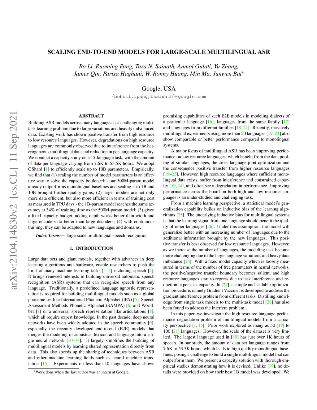 Building ASR models across many languages is a challenging multi-task learning problem due to large variations and heavily unbalanced data. Existing work has shown positive transfer from high resource to low resource languages. However, degradations on high resource languages are commonly observed due to interference from the heterogeneous multilingual data and reduction in per-language capacity. We conduct a capacity study on a 15-language task, with the amount of data per language varying from 7.6K to 53.5K hours. We adopt GShard [1] to efficiently scale up to 10B parameters. Empirically, we find that (1) scaling the number of model parameters is an effective way to solve the capacity bottleneck - our 500M-param model already outperforms monolingual baselines and scaling it to 1B and 10B brought further quality gains; (2) larger models are not only more data efficient, but also more efficient in terms of training cost as measured in TPU days - the 1B-param model reaches the same accuracy at 34% of training time as the 500M-param model; (3) given a fixed capacity budget, adding depth works better than width and large encoders do better than large decoders; (4) with continuous training, they can be adapted to new languages and domains.