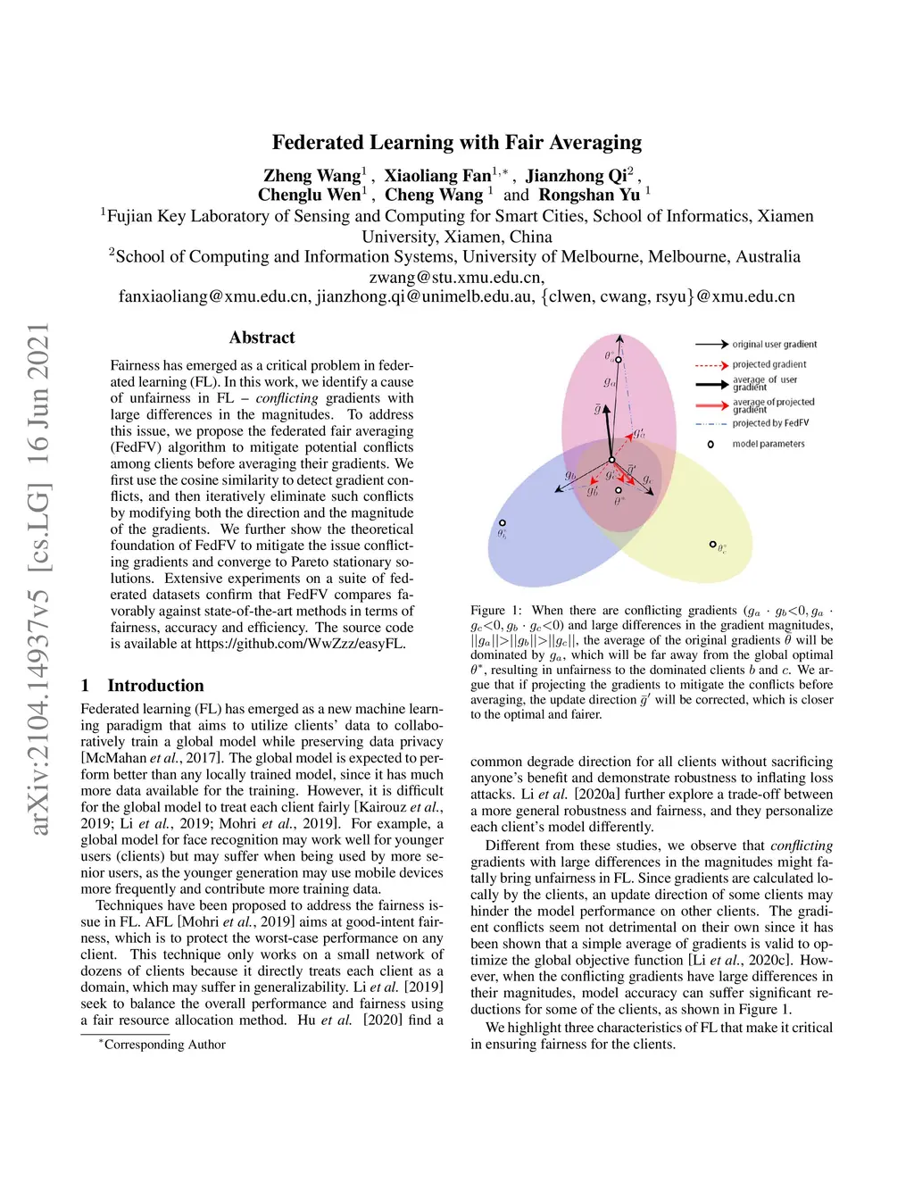 Fairness has emerged as a critical problem in federated learning (FL). In this work, we identify a cause of unfairness in FL -- conflicting gradients with large differences in the magnitudes. To address this issue, we propose the federated fair averaging (FedFV) algorithm to mitigate potential conflicts among clients before averaging their gradients. We first use the cosine similarity to detect gradient conflicts, and then iteratively eliminate such conflicts by modifying both the direction and the magnitude of the gradients. We further show the theoretical foundation of FedFV to mitigate the issue conflicting gradients and converge to Pareto stationary solutions. Extensive experiments on a suite of federated datasets confirm that FedFV compares favorably against state-of-the-art methods in terms of fairness, accuracy and efficiency. The source code is available at https://github.com/WwZzz/easyFL.