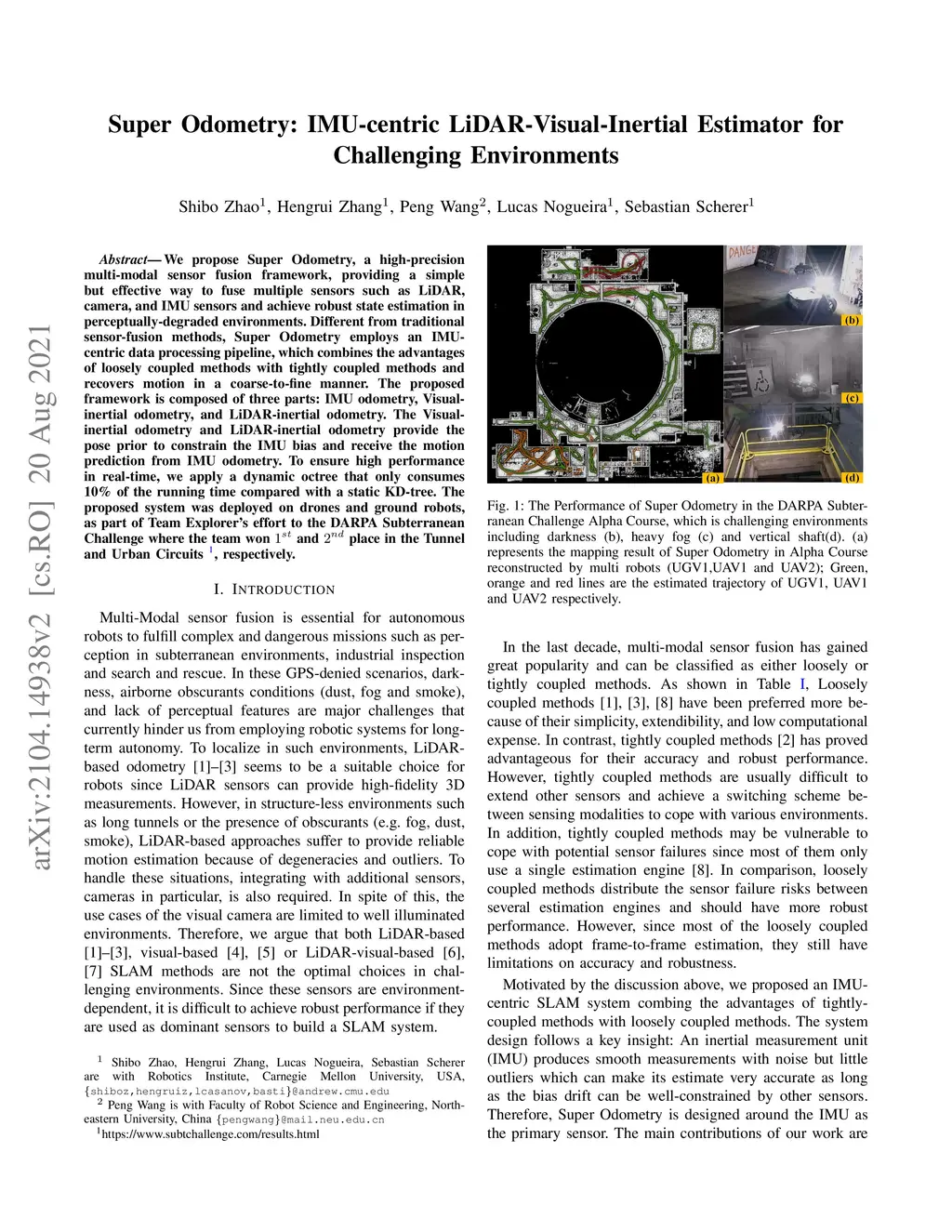 We propose Super Odometry, a high-precision multi-modal sensor fusion framework, providing a simple but effective way to fuse multiple sensors such as LiDAR, camera, and IMU sensors and achieve robust state estimation in perceptually-degraded environments. Different from traditional sensor-fusion methods, Super Odometry employs an IMU-centric data processing pipeline, which combines the advantages of loosely coupled methods with tightly coupled methods and recovers motion in a coarse-to-fine manner. The proposed framework is composed of three parts: IMU odometry, visual-inertial odometry, and laser-inertial odometry. The visual-inertial odometry and laser-inertial odometry provide the pose prior to constrain the IMU bias and receive the motion prediction from IMU odometry. To ensure high performance in real-time, we apply a dynamic octree that only consumes 10 % of the running time compared with a static KD-tree. The proposed system was deployed on drones and ground robots, as part of Team Explorer's effort to the DARPA Subterranean Challenge where the team won and place in the Tunnel and Urban Circuits, respectively.