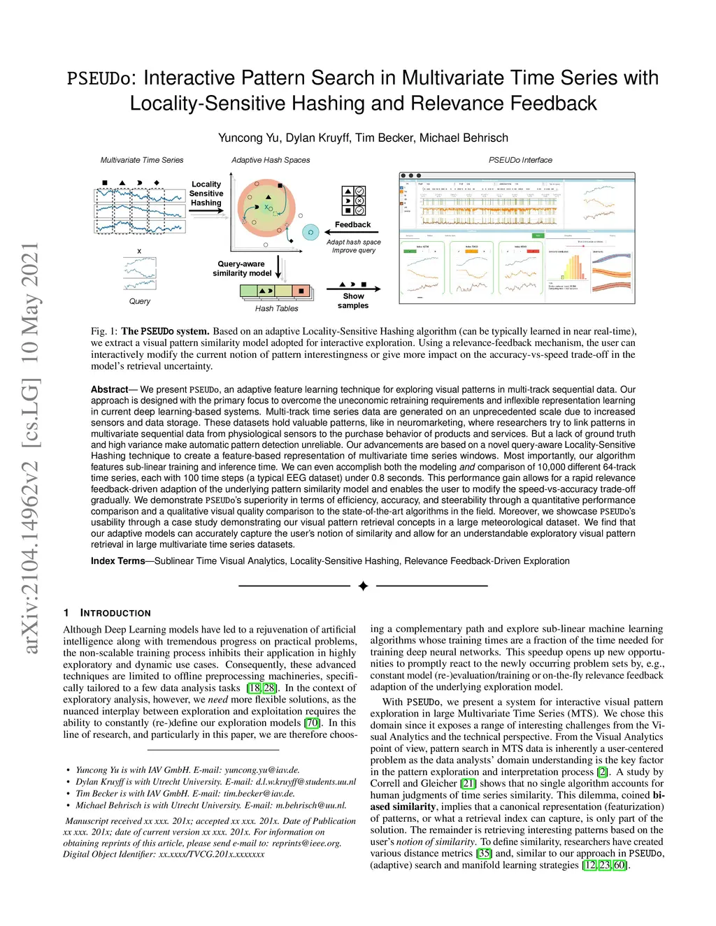 We present PSEUDo, an adaptive feature learning technique for exploring visual patterns in multi-track sequential data. Our approach is designed with the primary focus to overcome the uneconomic retraining requirements and inflexible representation learning in current deep learning-based systems. Multi-track time series data are generated on an unprecedented scale due to increased sensors and data storage. These datasets hold valuable patterns, like in neuromarketing, where researchers try to link patterns in multivariate sequential data from physiological sensors to the purchase behavior of products and services. But a lack of ground truth and high variance make automatic pattern detection unreliable. Our advancements are based on a novel query-aware locality-sensitive hashing technique to create a feature-based representation of multivariate time series windows. Most importantly, our algorithm features sub-linear training and inference time. We can even accomplish both the modeling and comparison of 10,000 different 64-track time series, each with 100 time steps (a typical EEG dataset) under 0.8 seconds. This performance gain allows for a rapid relevance feedback-driven adaption of the underlying pattern similarity model and enables the user to modify the speed-vs-accuracy trade-off gradually. We demonstrate superiority of PSEUDo in terms of efficiency, accuracy, and steerability through a quantitative performance comparison and a qualitative visual quality comparison to the state-of-the-art algorithms in the field. Moreover, we showcase the usability of PSEUDo through a case study demonstrating our visual pattern retrieval concepts in a large meteorological dataset. We find that our adaptive models can accurately capture the user's notion of similarity and allow for an understandable exploratory visual pattern retrieval in large multivariate time series datasets.